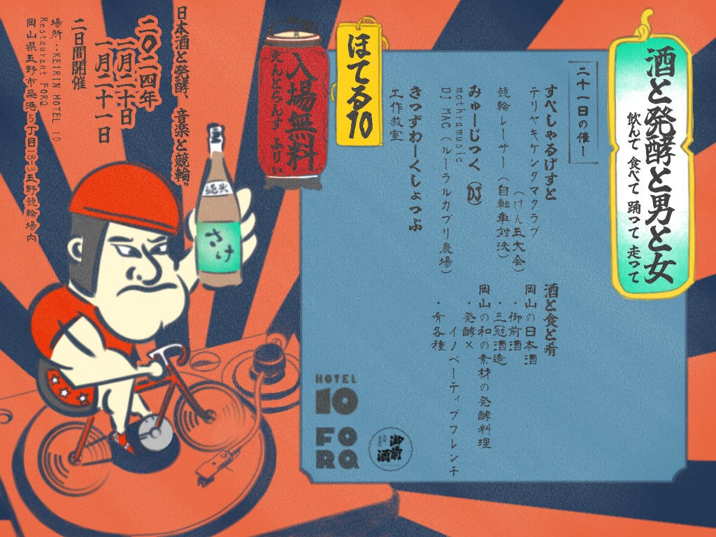 岡山県の玉野競輪場一体型ホテル「KEIRIN HOTEL 10 by 温故知新」併設のレストラン「Restaurant FORQ(レストランフォーク)」(所在地:岡山県玉野市、総支配人:石川 雅一)では、“「酒と発酵と男と女」〜飲んで食べて踊って走って〜”と題し、日本酒と発酵をテーマにしたフード&音楽イベントを2024年1月20日(土)・21日(日)に開催します。