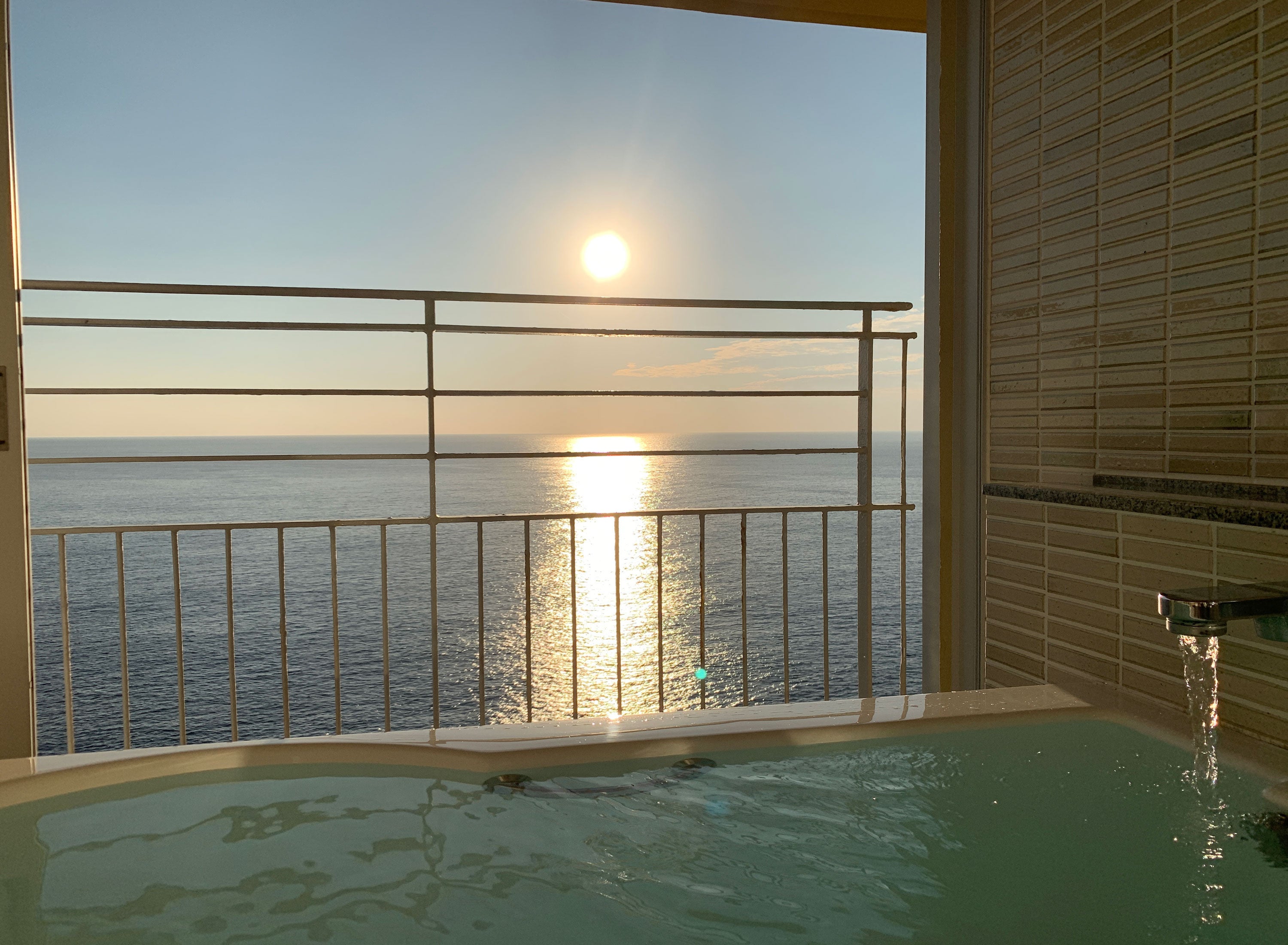 温泉スイートは全室オーシャンビューとなっており、鮮やかな青色のグラデーションを描く屋久島の海を独り占めすることができます。お部屋内に源泉かけ流し展望風呂を設えており、24時間お好きな時に天然温泉をお楽しみいただけます。窓一面に広がる大海原と打ち寄せる波音に包まれながら、寛ぎのひとときをお過ごしください。