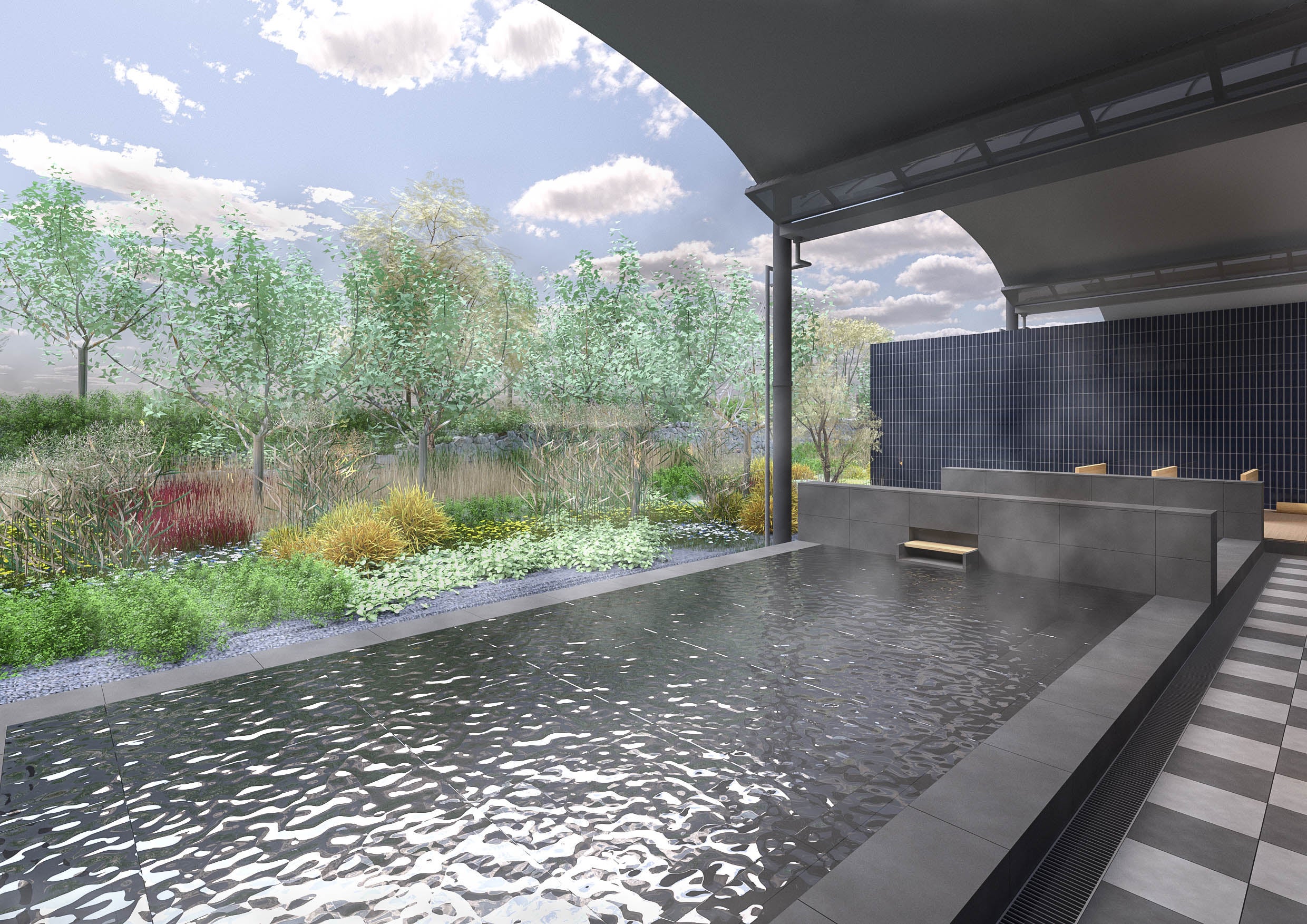 大浴場には、露天風呂と内湯、サウナを備えています。高知の自然豊かな里山をモチーフにした露天風呂で、旅の疲れが癒せます。内湯には、大きな木綿の布をキャンバスに色鮮やかに染め上げる高知の手作り工芸品「フラフ」を模した壁画が特徴です。番台をイメージした入口では土佐犬のオブジェがお出迎えします。湯上り処には、涼をとるのにうれしい飲み物として、高知の季節を感じられる柑橘類を使ったドリンクや水出し茶をご用意します。