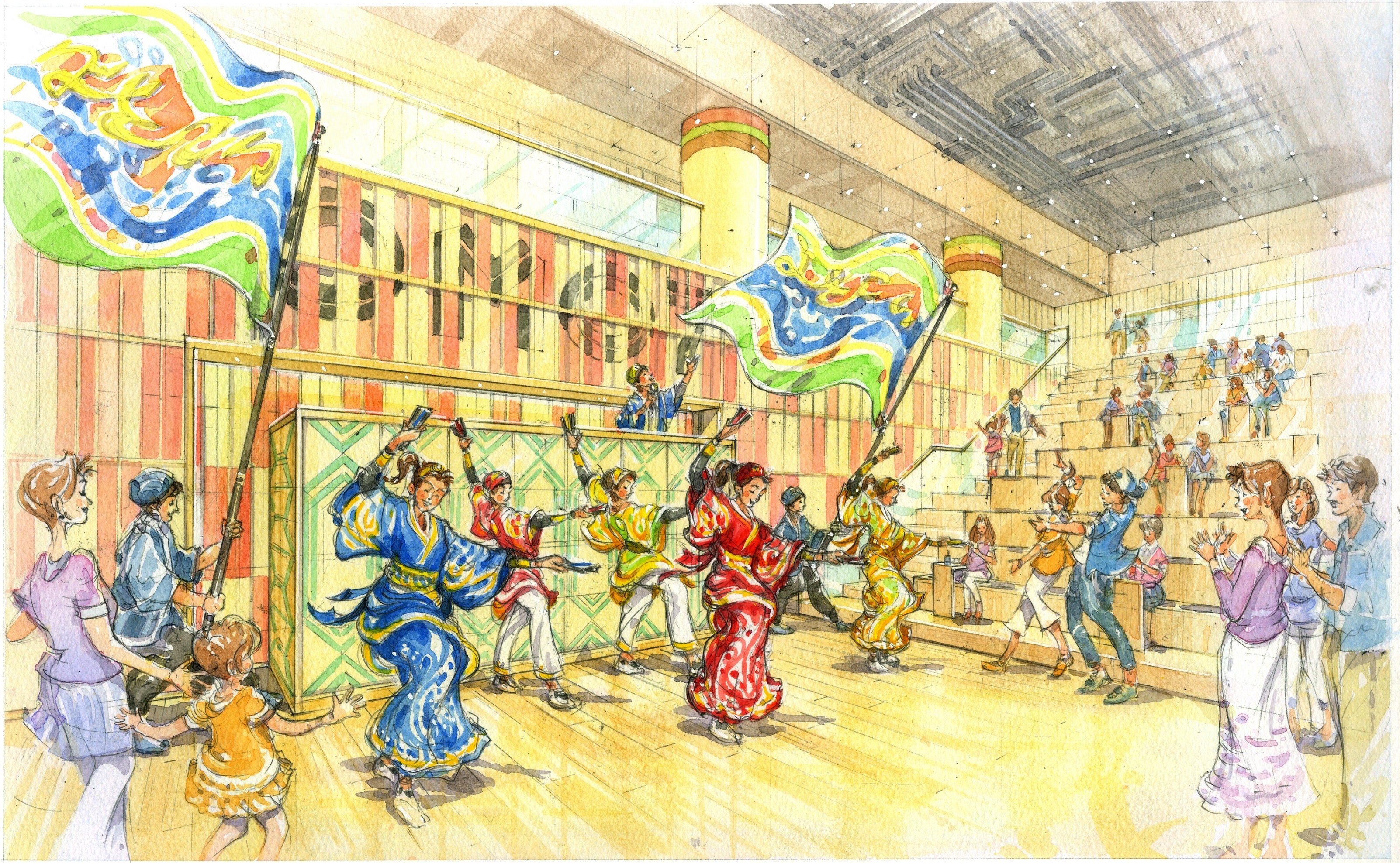 OMOベースでは、高知の夏の風物詩「よさこい祭り」を毎晩開催し、スタッフ自らが踊ります。よさこい踊りには欠かせない鳴子やフラフ*を持って、5名の踊り子が「正調(せいちょう)よさこい鳴子踊り」はもちろん、OMO7高知オリジナルの楽曲に合わせ艶やかな演舞を披露します。踊りは、よさこい鳴子踊りの第一人者でもある「スガジャズダンススタジオ」國友裕一郎氏がプロデュースしています。