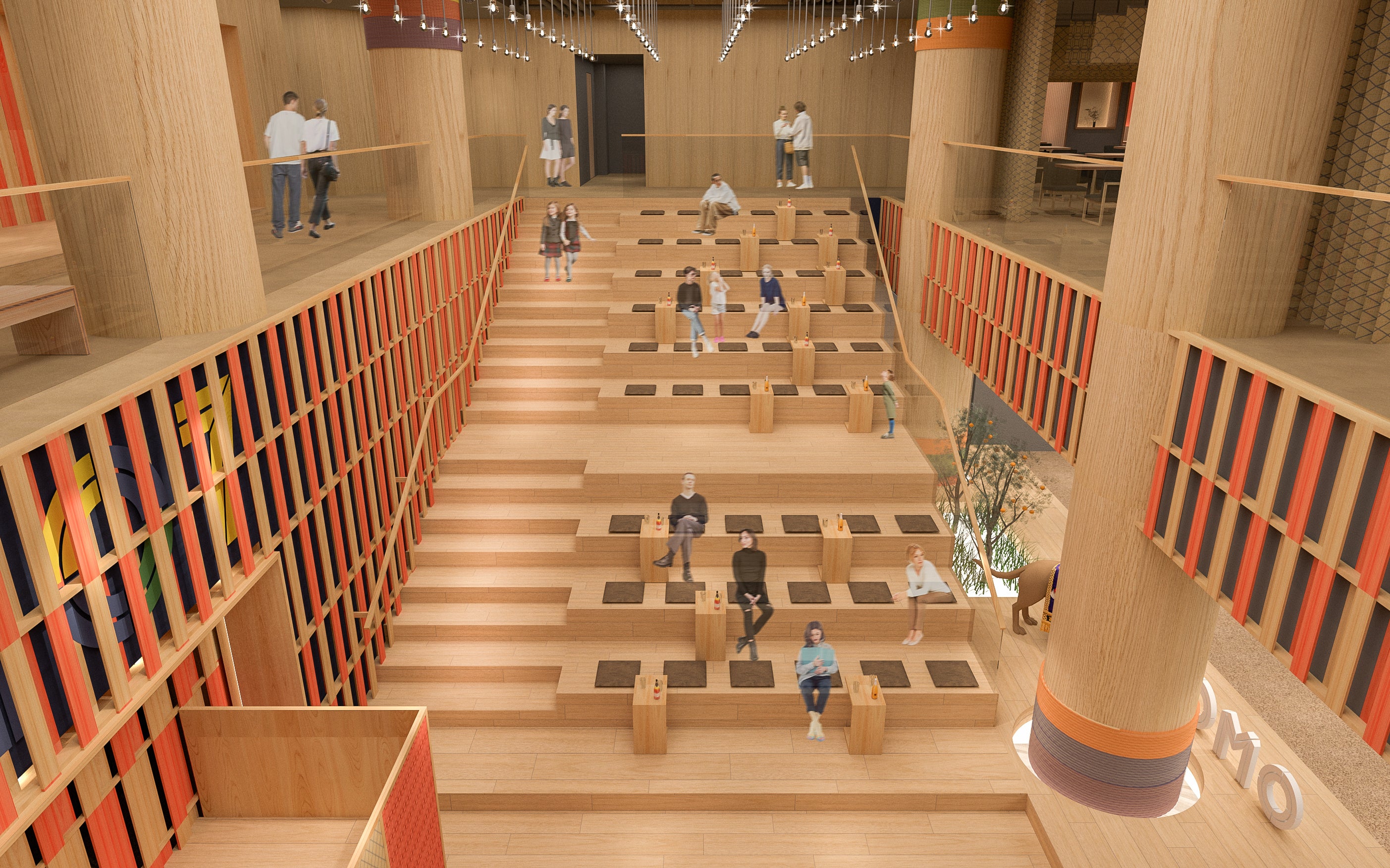 OMOベースは、ロビーやラウンジ、カフェなど様々な機能を備えたパブリックスペースです。1階から2階に続く大階段が特徴で、活気あふれるよさこい祭りのように、色とりどりで華やかな雰囲気を演出しています。階段状の座席ではおしゃべりを楽しんだり、旅の計画を立てたり、思い思いの時間を過ごすことができます。