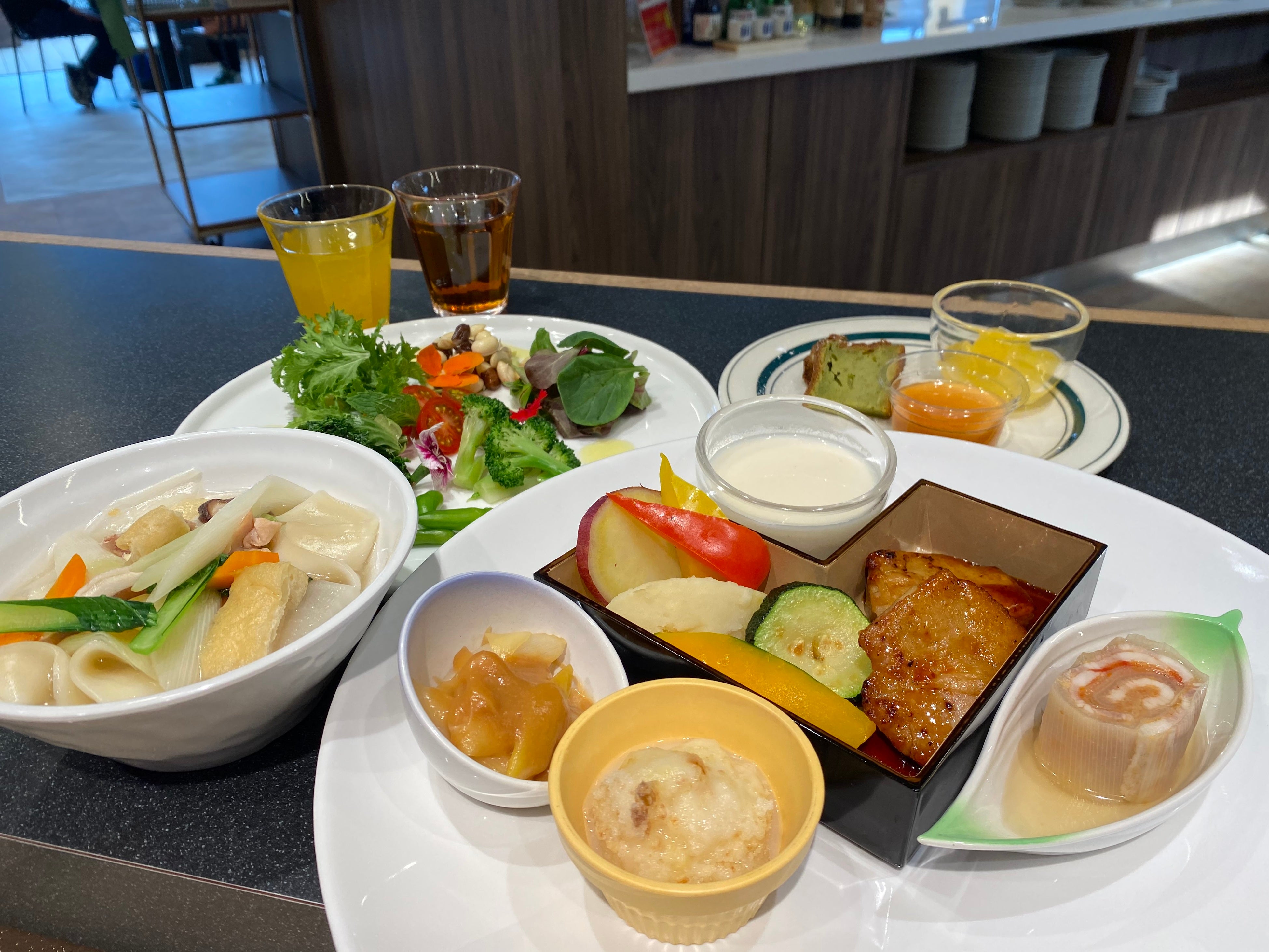 昼食は『チキングリルと深谷ねぎづくし』。メインと深谷ねぎを使った料理のほか、地元の野菜を中心としたビュッフェや郷土料理の煮ぼうとう、ソフトドリンクバーも付きます。