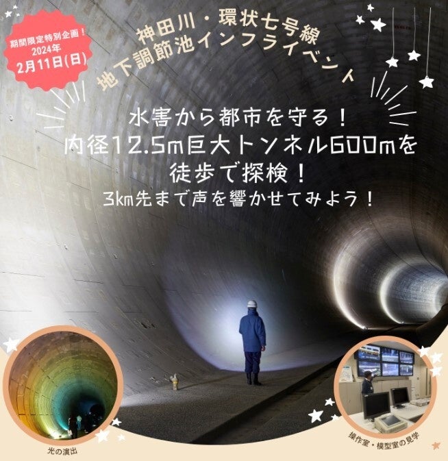 当社では、この施設を使用したコンサートツアーなどを実施してきましたが、今回は、普段公開されていない環状七号線地下調節池の善福寺川取水施設から神田川取水施設までの600mを徒歩で通り抜けするイベントとなります。巨大トンネルを通り抜けするイベントは期間限定!本イベントでは、日常では経験できないトンネル内での声の反響を体感頂けます。またSDGsボードゲーム公認ファシリテーターによる、『目標9:産業と技術革新の基盤をつくろう』についての解説など、東京を水害から守る防災施設に興味を持っていただける内容となっています。