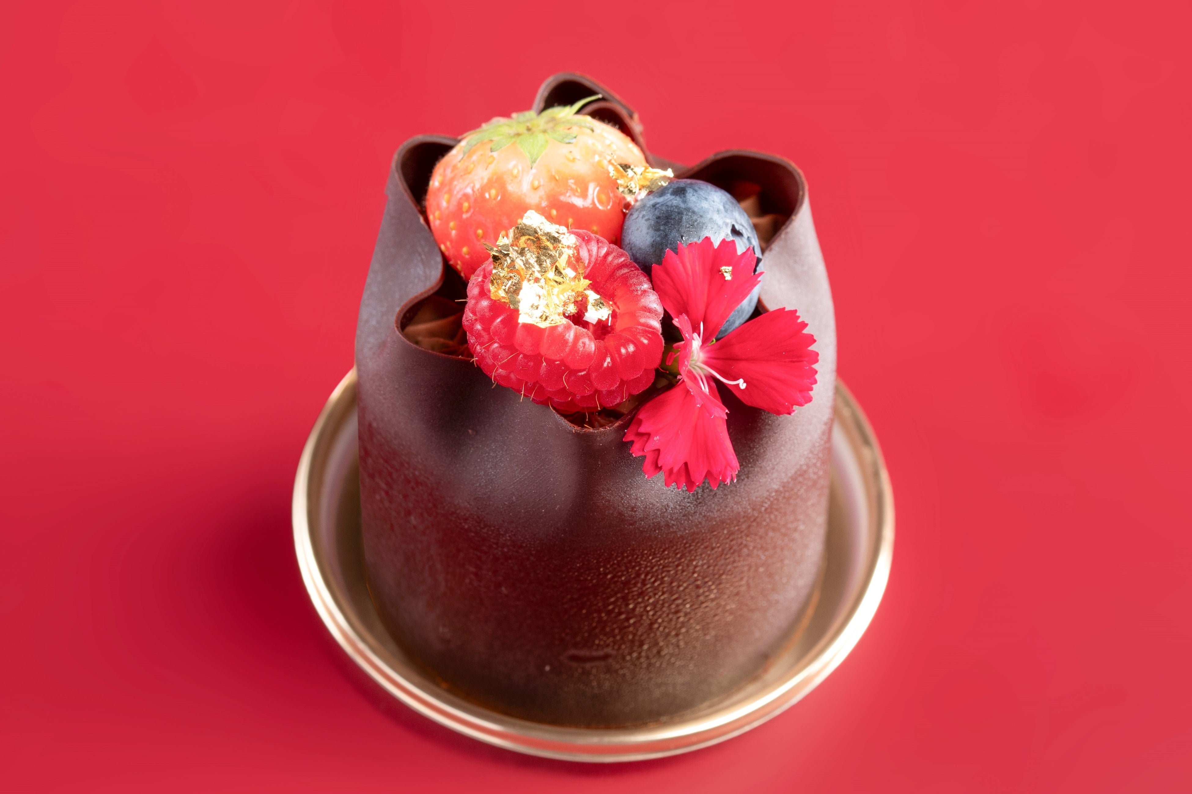 花束をイメージしデコレーションした、プレゼントにおすすめのチョコレートケーキ。ココアのスポンジ生地、チョコレートガナッシュ、チョコレートムースを層にしたケーキをスイートチョコレートでラッピングし、ベリーを添えました。