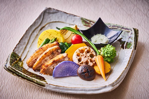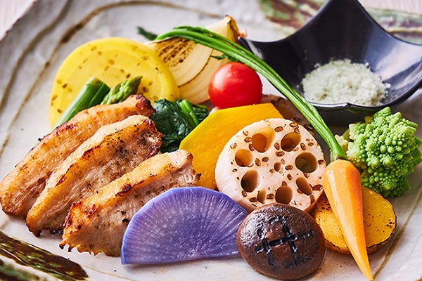 ・加賀蓮根・彩り野菜の炭火焼き 豚トロにんにく漬け添え