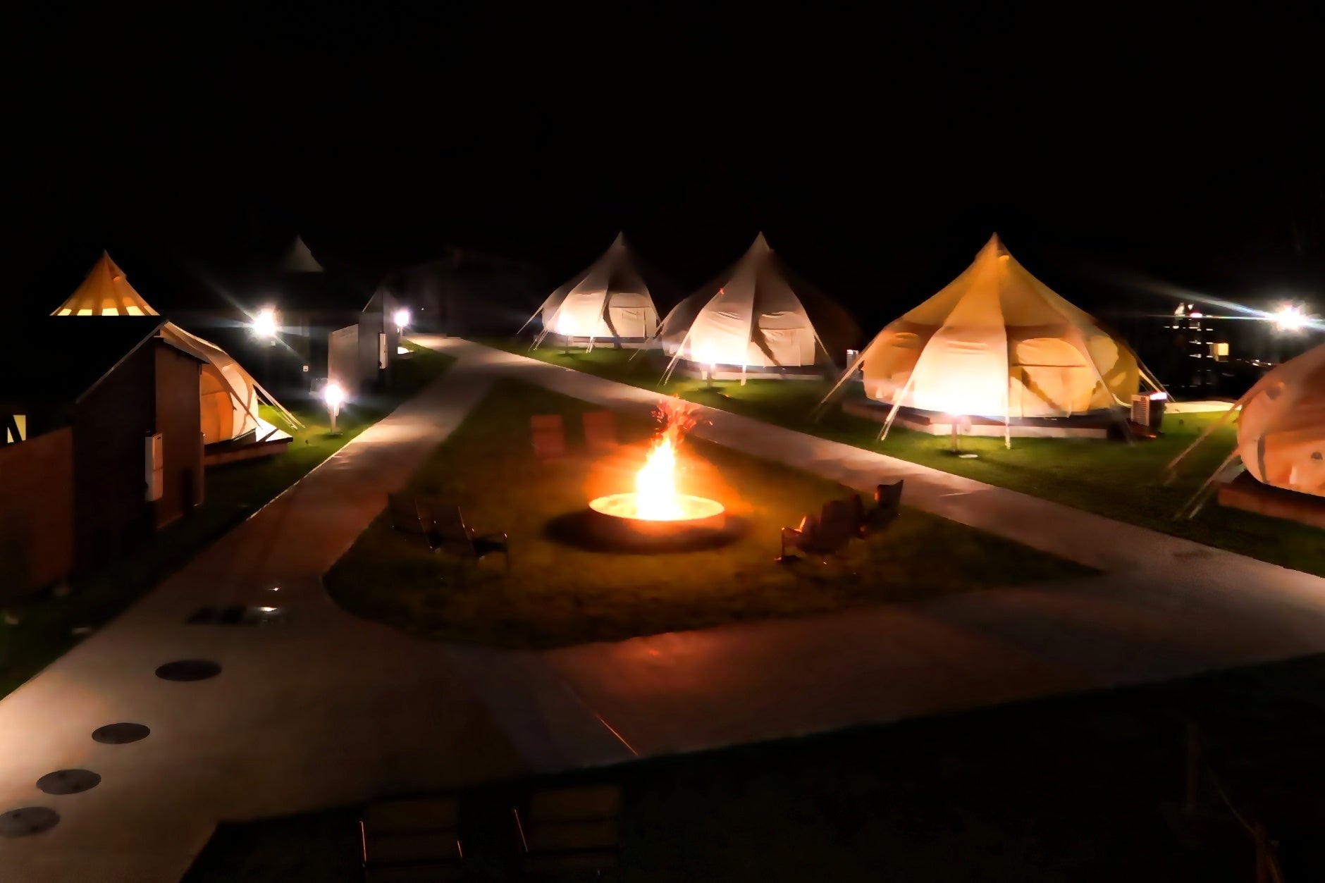 NAGUの夜はファイヤーピットに火が灯ります。各サイトにもスノーピークの焚き火台をご用意しております。焚き火と星空を眺めて大切な人と過ごす至福のひとときをお過ごしいただけます。