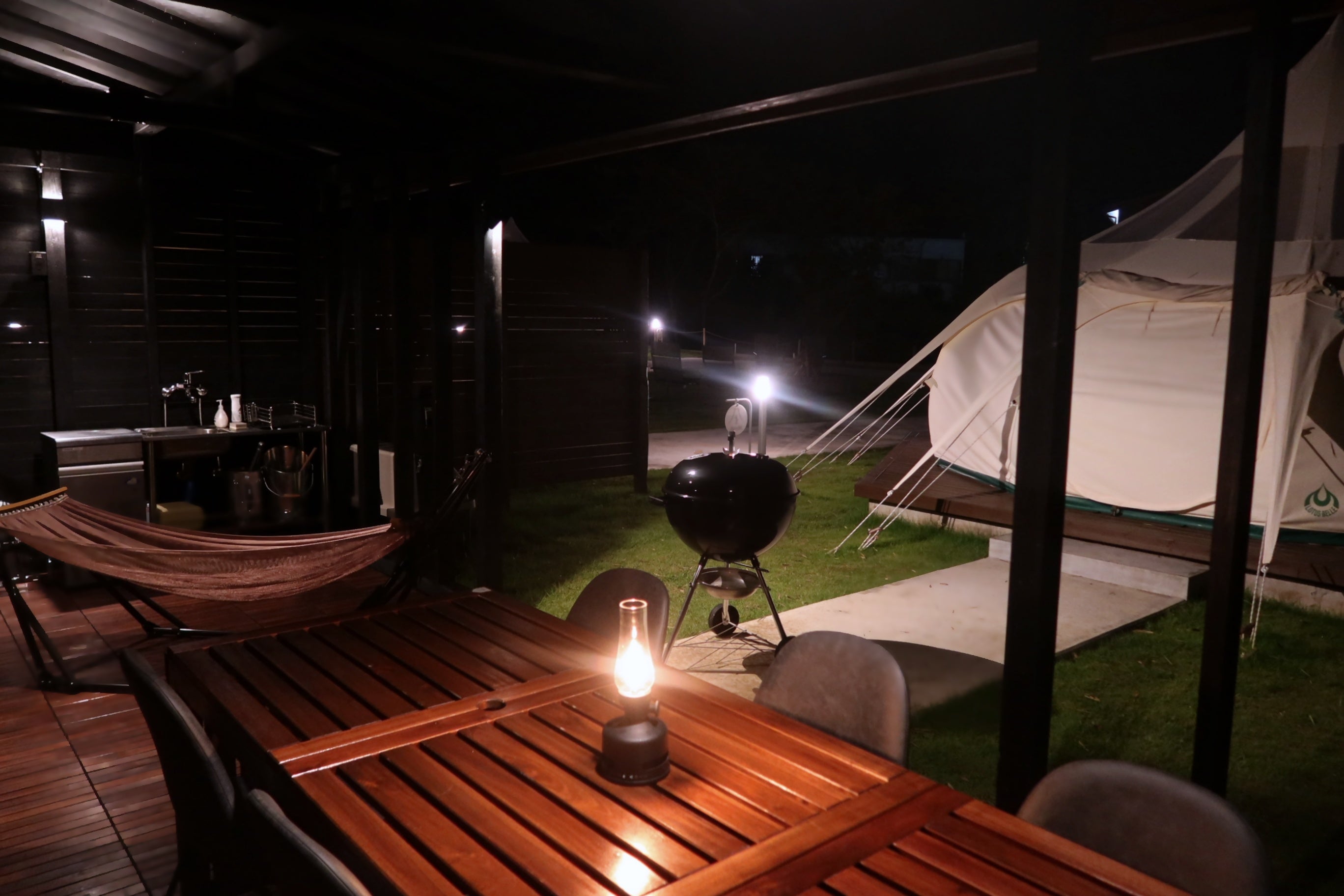 完全貸切りの屋根付きのダイニングスペースでは、四季折々で異なる自然を感じながらお食事をお楽しみいただけます。シンク、冷蔵庫、製氷機、ウォーターサーバーを配し、BBQグリル、木炭3kg、食器類、塩、胡椒、トングやナイフ、まな板など調理器具も一式ご用意させていただきます。お好きな食材と調味料をご準備頂き、お好きなスタイルのお食事をお楽しみください。冬の期間は、外でも暖かく過ごせるようジェットヒーターをご用意しております。