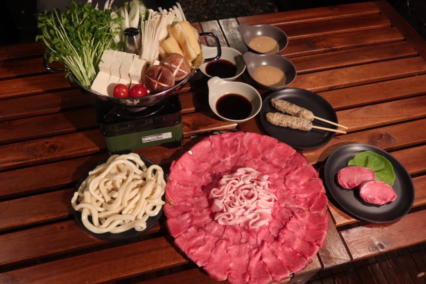 千葉県勝浦市のテントサウナ併設型グランピング施設『NAGUKATSUURA』では、牛タンを丸々一本使った「牛タンしゃぶしゃぶ」を提供します。滞在中、屋根付きの貸切ダイニングスペースにて、冬ならではの自然の美しさを感じながらお食事とサウナ、焚き火で心身ともに温まり至福の「ととのう」体験を心ゆくまでご堪能ください。