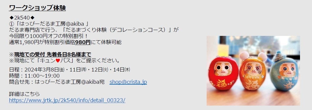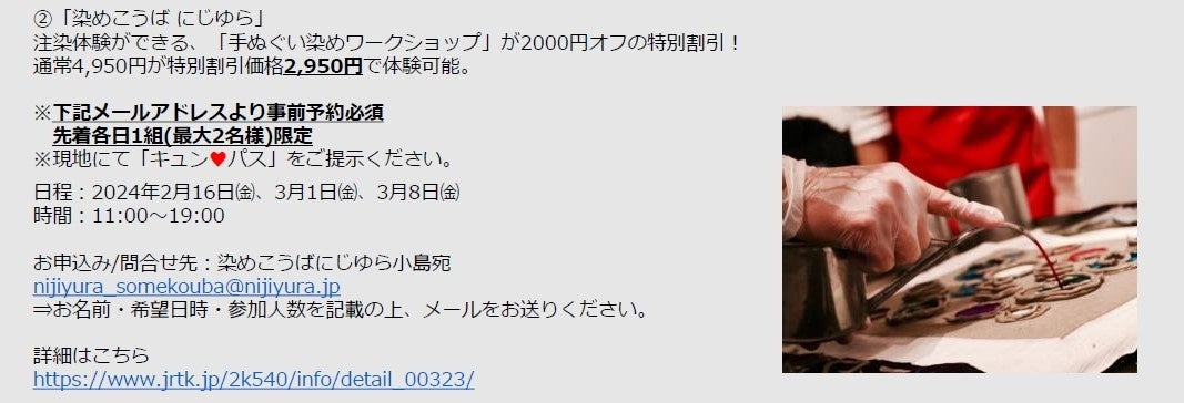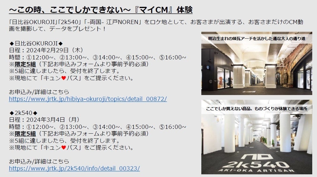東日本旅客鉄道株式会社が発売する「旅せよ平日!JR東日本たびキュン♥早割パス」をご利用の皆さまに、株式会社ジェイアール東日本都市開発の運営するさまざまな施設で受けられる、「~この時、ここでしかできない~体験」をご用意いたしました。