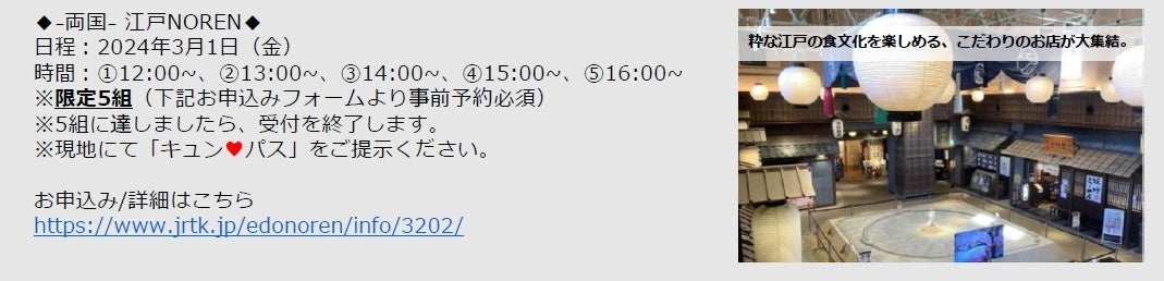 東日本旅客鉄道株式会社が発売する「旅せよ平日!JR東日本たびキュン♥早割パス」をご利用の皆さまに、株式会社ジェイアール東日本都市開発の運営するさまざまな施設で受けられる、「~この時、ここでしかできない~体験」をご用意いたしました。