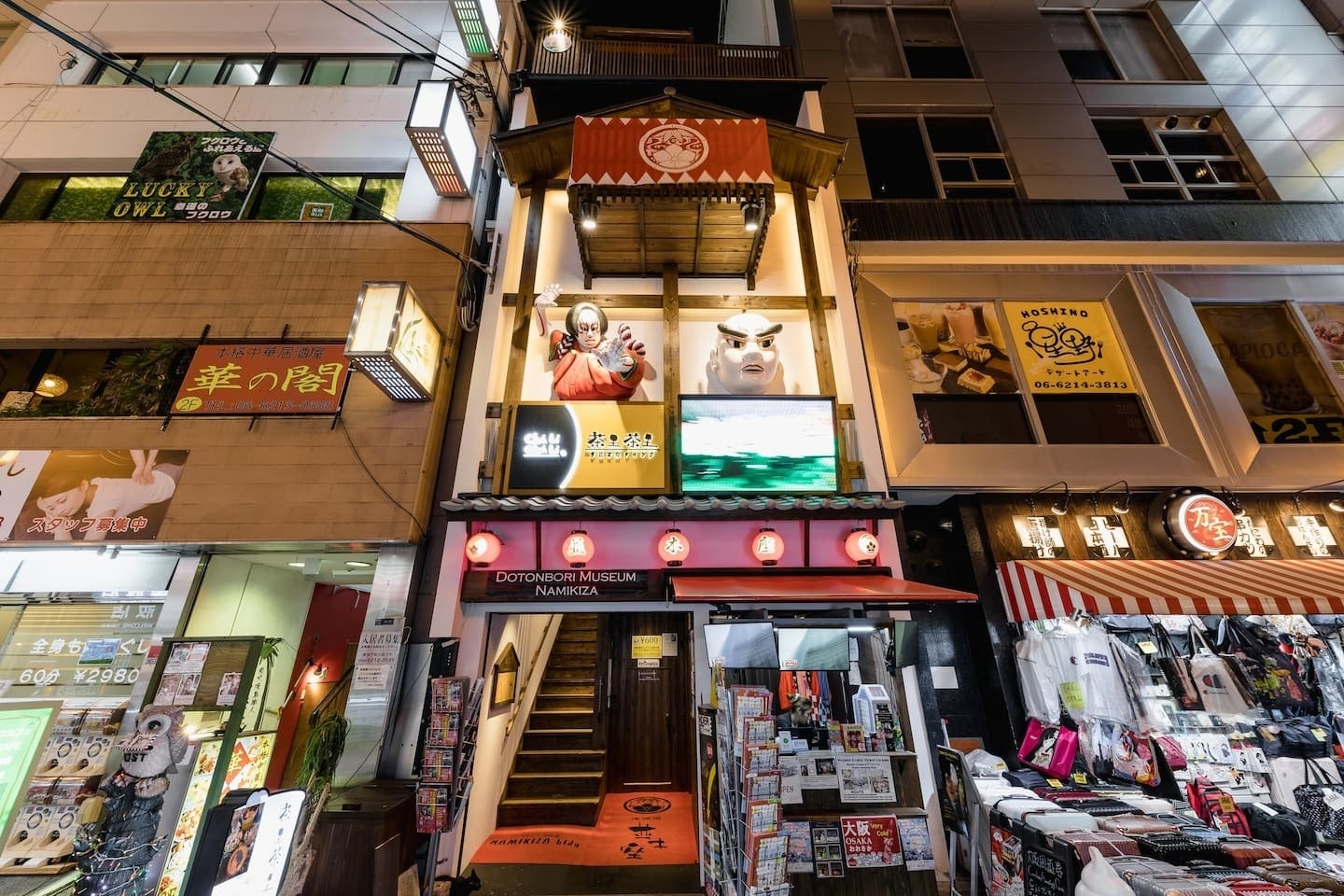 眠らない街、道頓堀に誕生した新たなランドマーク、都市型民泊施設「AQUA CITÉ DOTONBORI」 with 「道頓堀ミュージアム並木座」。外観は道頓堀にあった芝居小屋の目印である太鼓櫓と、道頓堀で発展した歌舞伎と文楽の立体看板を、内観には金毘羅歌舞伎劇場金丸座を再現。動く文楽のかしらと歌舞伎の人形が圧倒的な存在感を放つ『体験×宿泊』一体型施設です。
