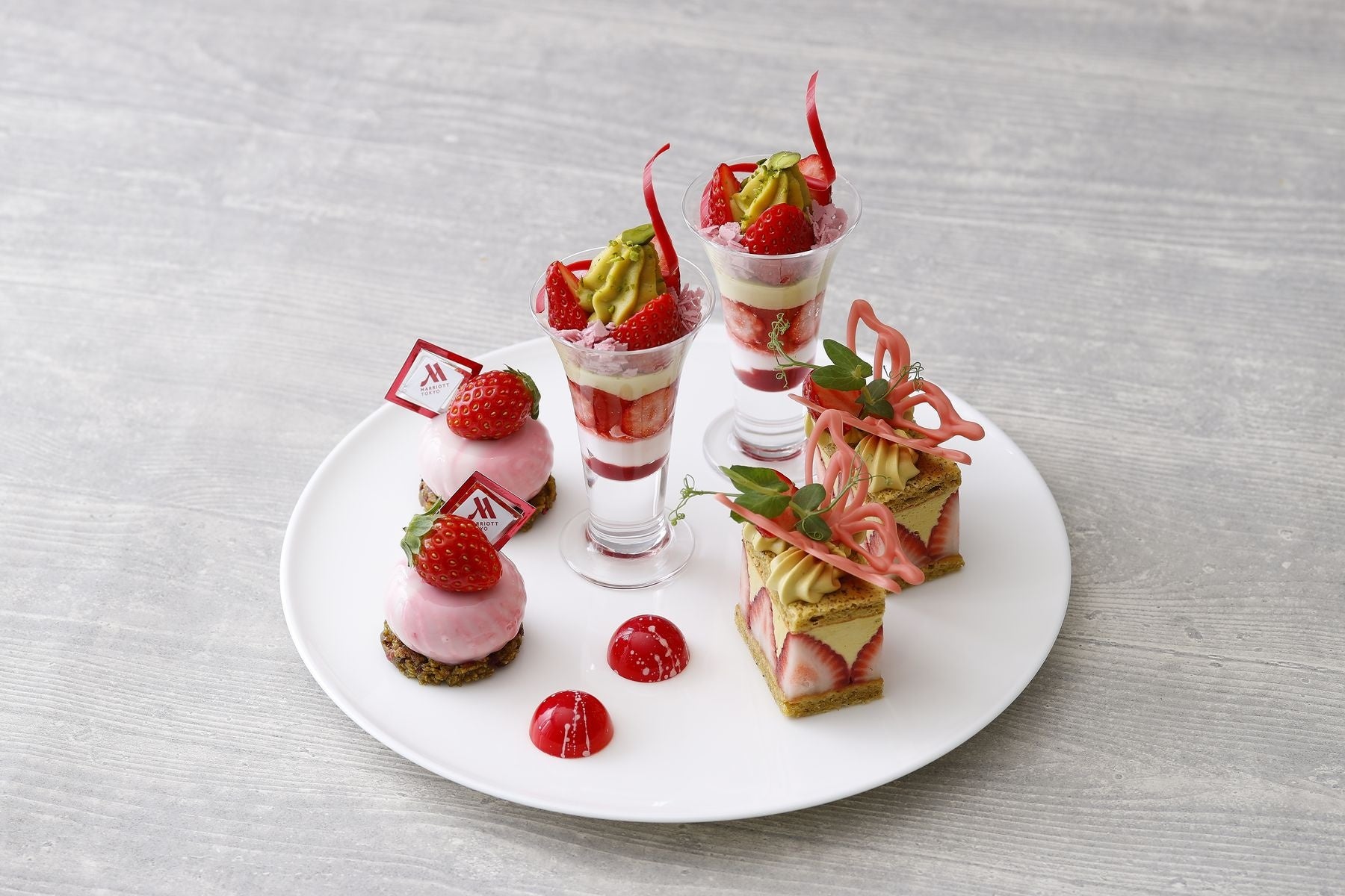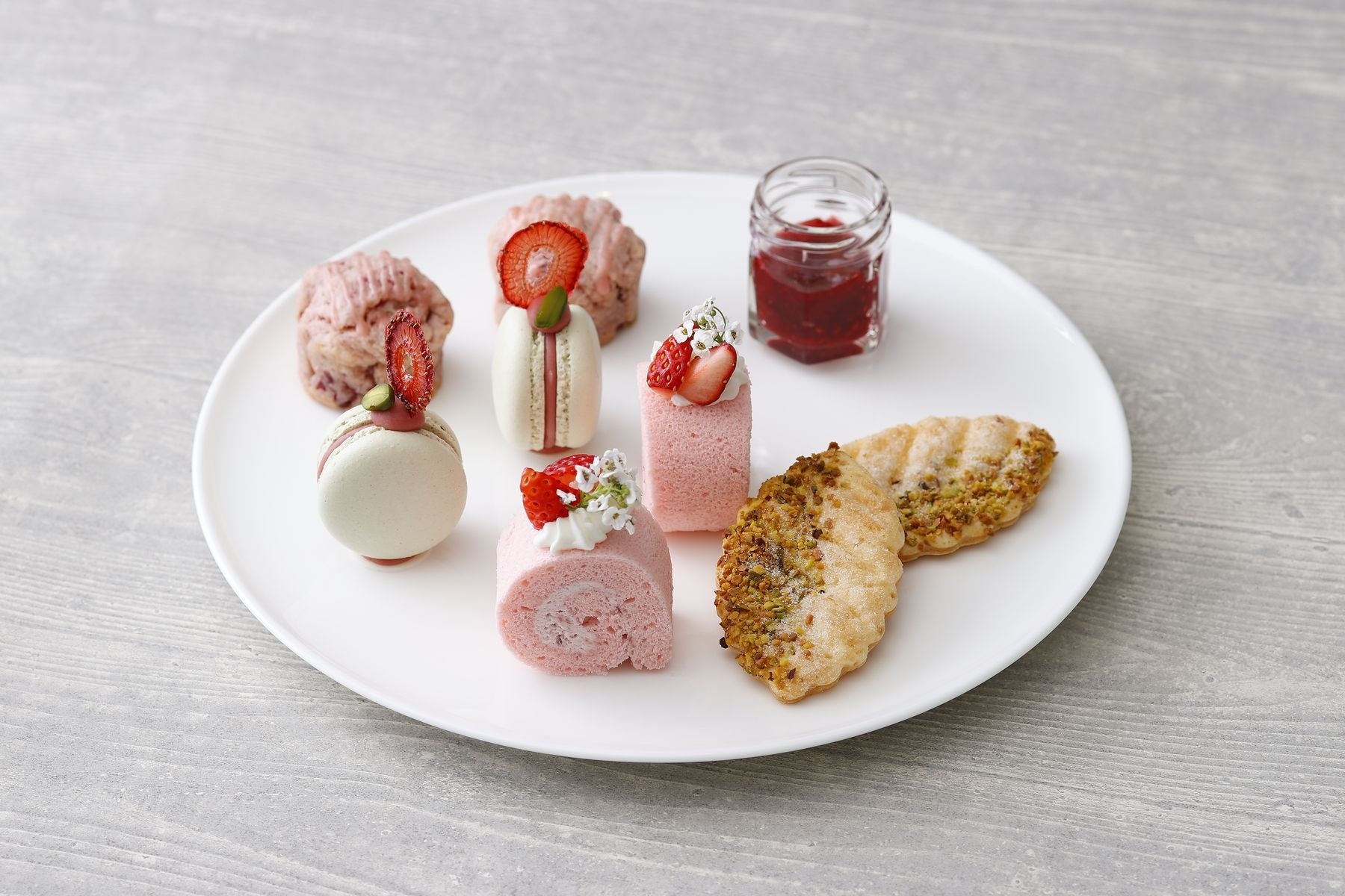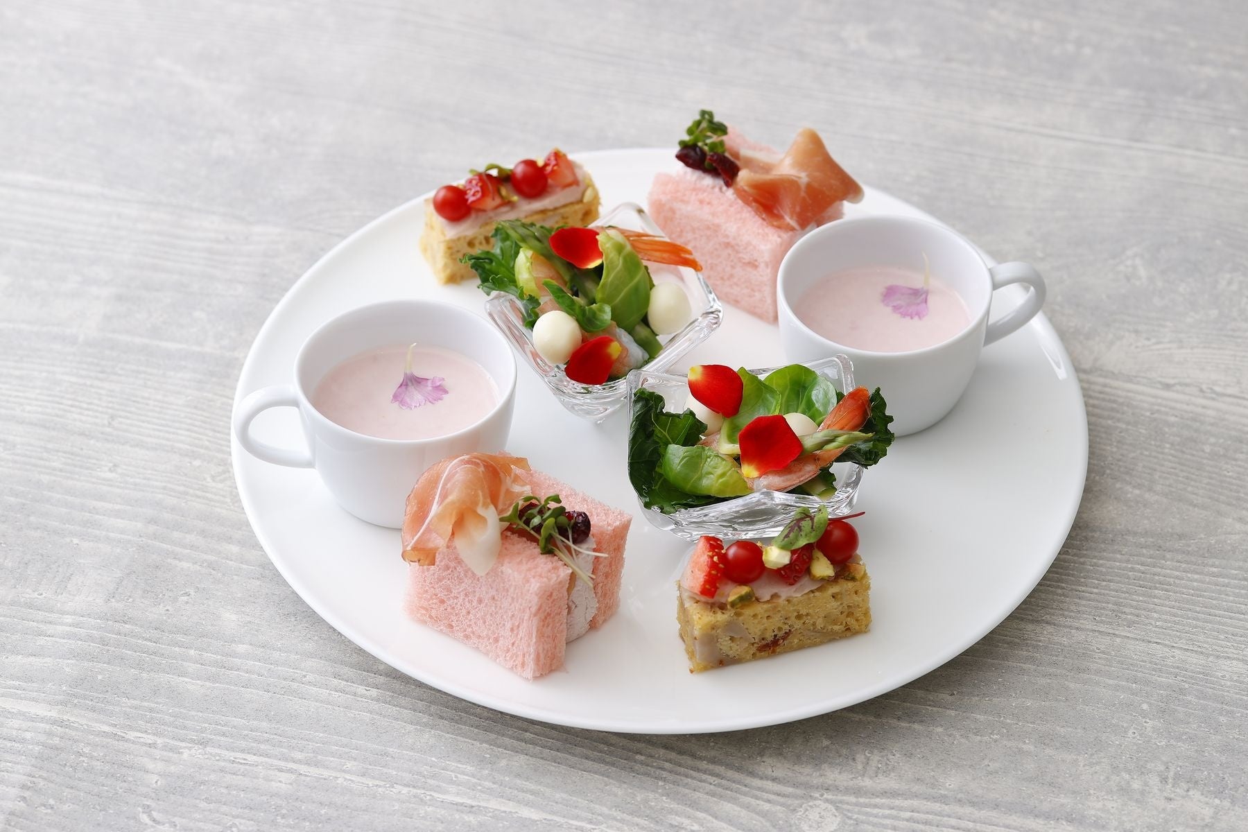 都会の中でも自然豊かな御殿山で、四季の移ろいを感じながらお楽しみいただく東京マリオットホテルのアフタヌーンティー。甘みと程よい酸味が絶妙ないちご「紅ほっぺ」と、”ナッツの女王”の異名を持つピスタチオを主役に迎え、それぞれの味わいを存分に堪能するスイーツ・セイボリーがテーブルに並びます。スイーツはいちごの断面が目を惹くフレジェやピスタチオと紅ほっぺのミニパフェ、ピスタチオの食感を楽しむリーフパイなど8種をご用意。香ばしく風味とコクが豊かなピスタチオと、甘酸っぱい「紅ほっぺ」が織りなす見た目も味わいもうららかな春を感じるラインアップです。セイボリーは、春の菜園をイメージしたサラダやピンク色がかわいらしいヴィシソワーズなど4品が並びます。