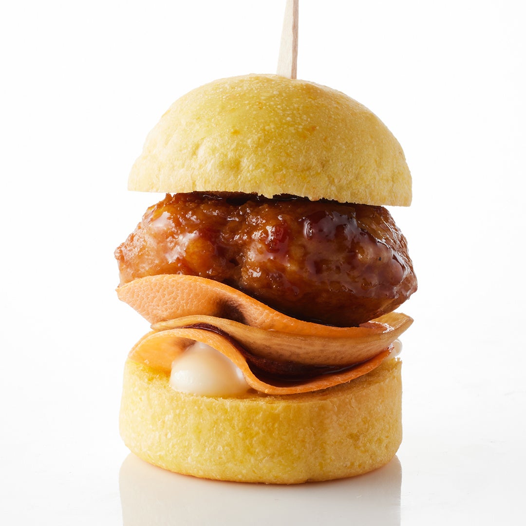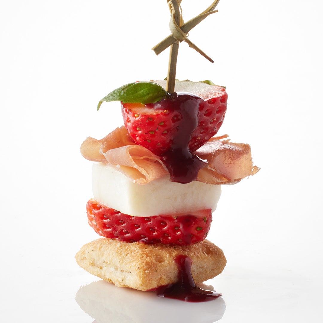 ストロベリーアフタヌーンティーのセイボリーには、静岡県産の食材を豊富に使用した4種類をご用意しています。富士山御殿どりの照り焼きと三島人参を重ねたスライダーバーガーや、七富モッツァレラチーズとイチゴと生ハムのカプレーゼ、フライドシュリンプと静岡県産豆腐のペーストを塗った旨味の強いトースト、そしてブロッコリーのクリームスープなど、どれも味わい深いこだわりの逸品となっています。