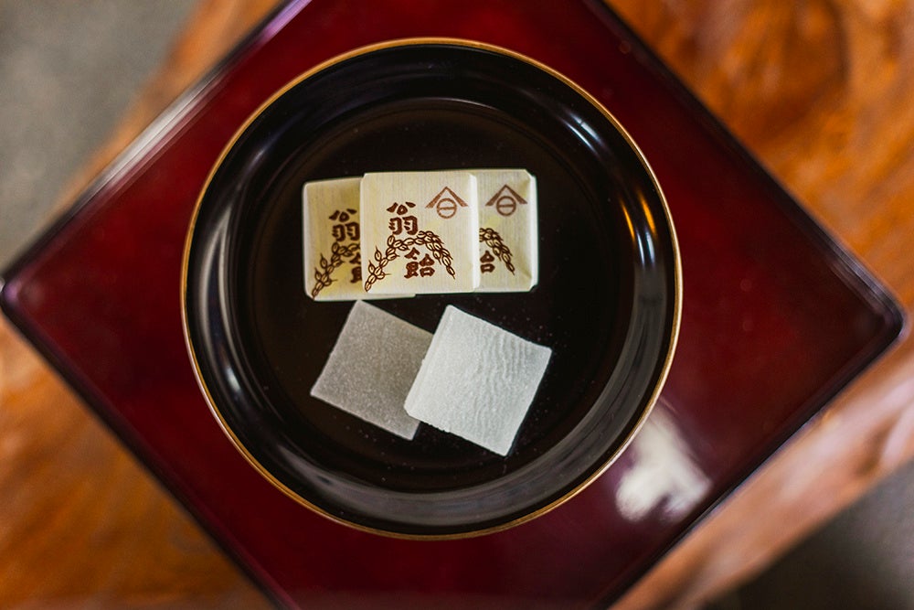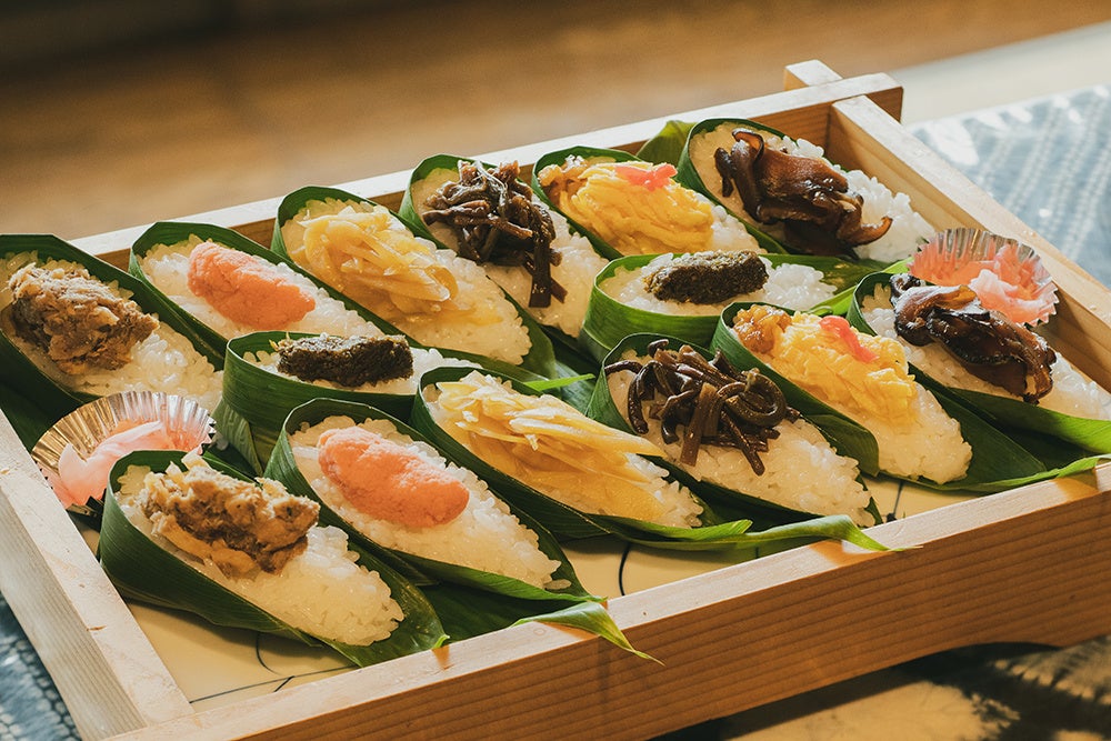 多彩な具材と酢飯のハーモニーが味わえる笹箕寿司の体験と、日本で最も古い飴屋さんが手掛ける水飴に寒天を加えて固めたお菓子のセット。