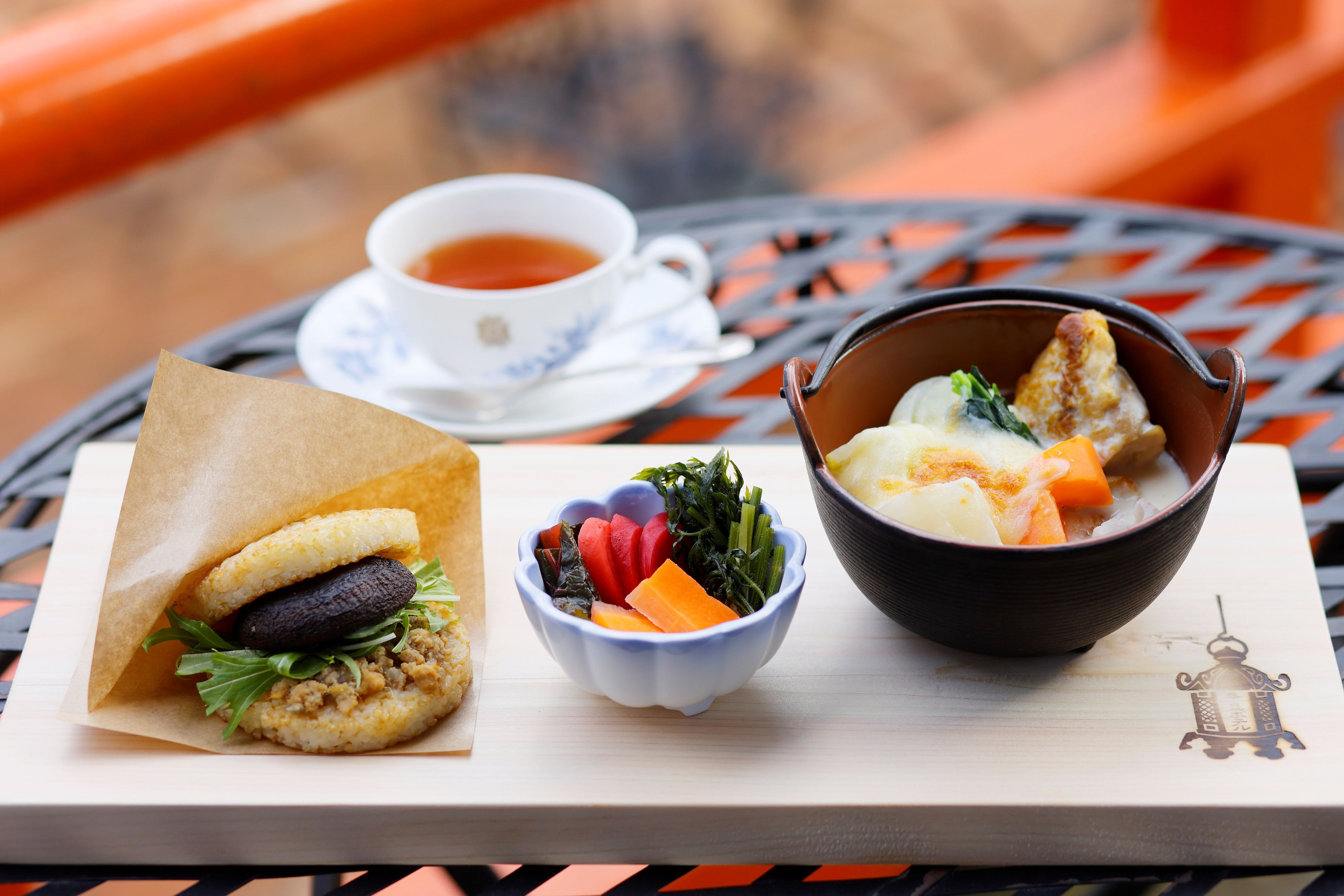 メニューは、昨年の12月、ホテルシェフが山添村の生産農家を訪問し、約1ヵ月の期間をかけて考案いたしました。内容は、豆乳のまろやかな味わいと野菜の旨味を活かした①山添野菜のクリームグラタン、風味豊かな味噌と野菜が織りなす上品な味が特徴の②山添野菜と豆くら味噌のライスバーガー、山添村の代表野菜で赤色がとても印象的な③片平あかねと山添野菜のピクルスです。また、これら3種の料理を盛り付ける木製プレートは、山添村の合資会社向井製材所さんから建築資材として使うことができない材木を譲り受け、当ホテルのスタッフが磨き上げ成形したものです。さらに、観光客やインバウンドのお客様にも気軽にランチを楽しみながら山添村について広く知ってもらうため、山添村の茶花紅茶もセットにし、3,500円(サービス料・税金込み)というリーズナブルな値段でご用意いたします。