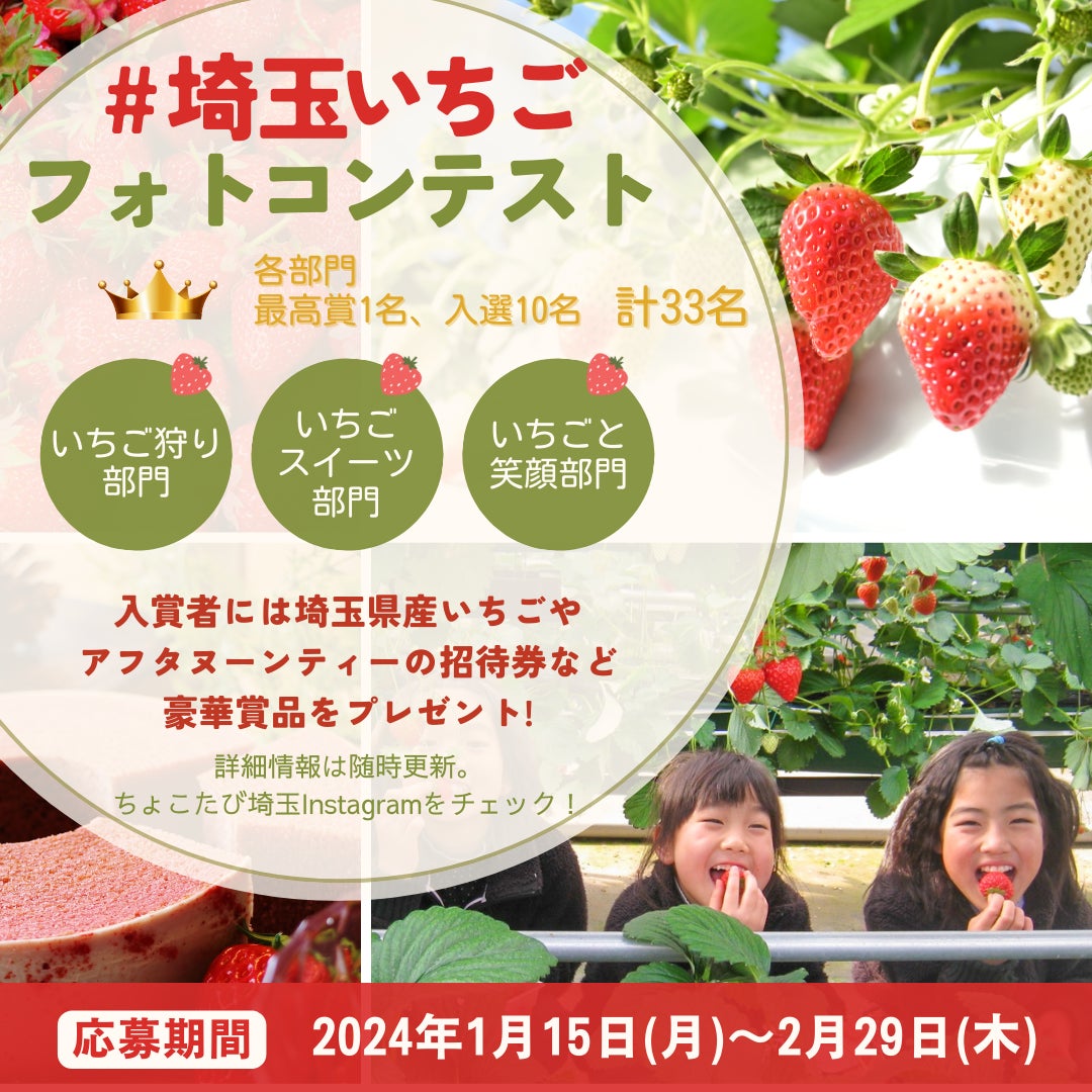 一般社団法人埼玉県物産観光協会(会長:朝霧重治)は、「埼玉のいちご」をテーマとしたInstagramフォトコンテストを1月15日(月)より開催いたします。