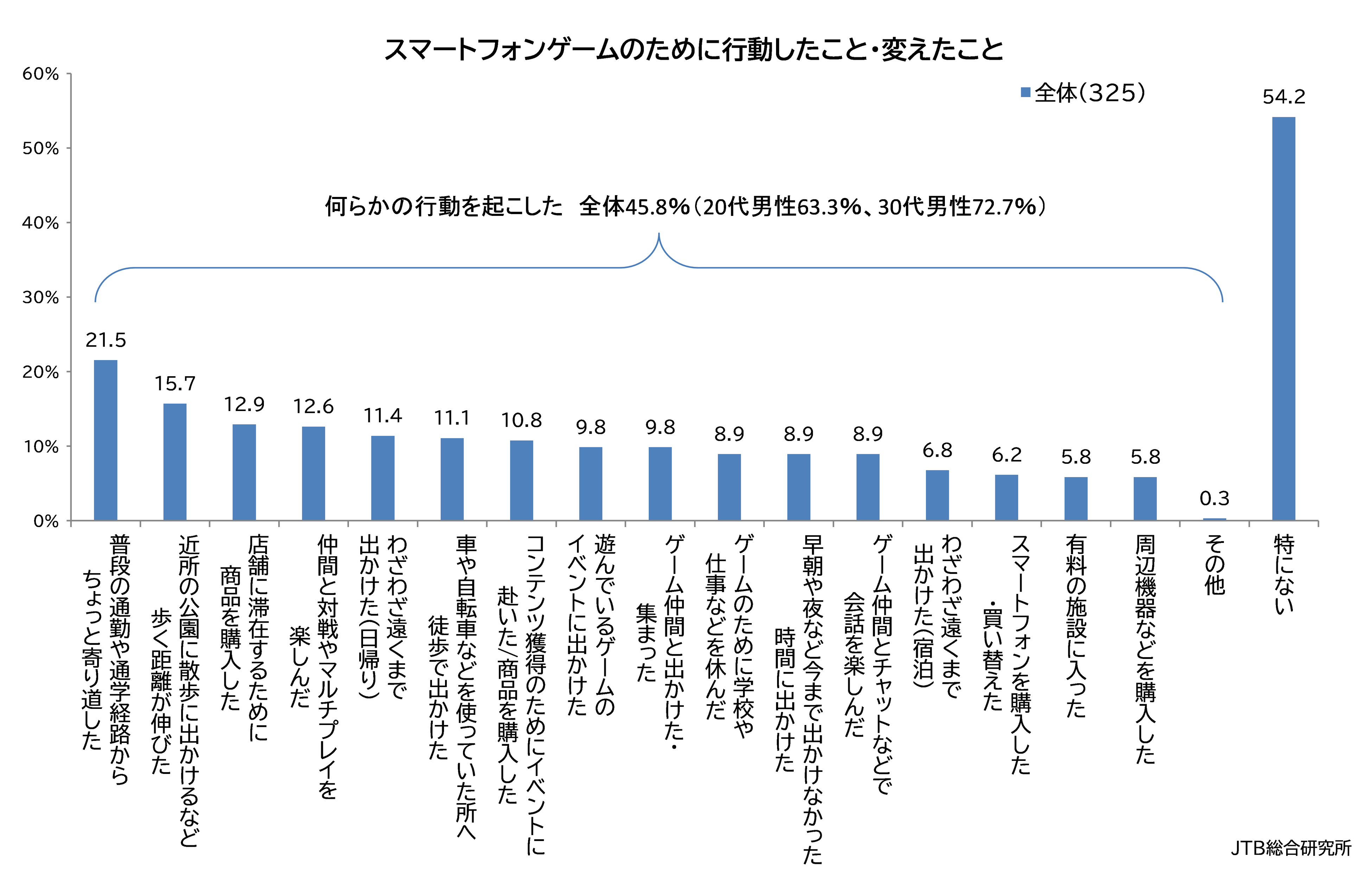スマートフォンゲームをやっている人のうち、ゲームのために「普段の通勤や通学の経路からちょっと寄り道した」、「店舗に滞在するために商品を購入した」など、何らかの行動変化を起こした人は、45.8%でした。性年代別にみると30代男性では72.7%、29歳以下の男性では63.3%と割合が高くなります(図7)。