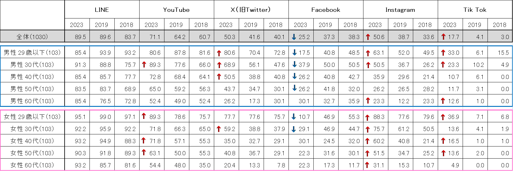 スマートフォンで利用する主なSNSや動画投稿サービスとしては、「LINE」、「YouTube」、「Instagram」、「X」が上位でした。「Instagram」と「TikTok」は2019年調査より10ポイント以上利用率が上昇し、幅広い年代に広がってきている様子がわかります。一方、Facebookは2019年調査より10ポイント以上利用率が減少しました。性年代別でみると、60代の女性の利用率は上昇したものの、男女ともに50代以下では、どの年代でも利用率が下がっています(表1)。
