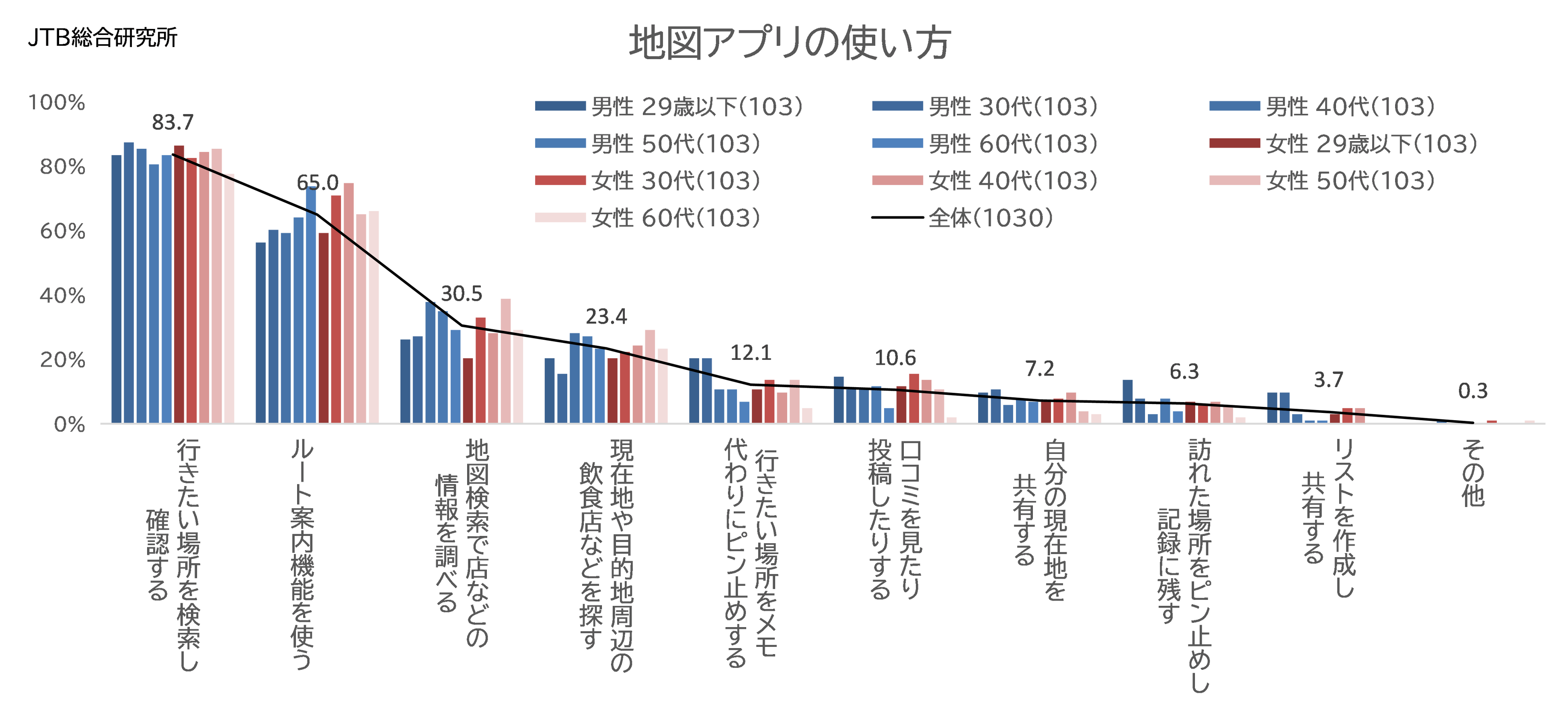次に、継続利用したいアプリについて聞いたところ、「検索エンジン」が1位となったほか、「地図アプリ」が2位に浮上しました(図4)。地図アプリをどのように使っているか、という質問では、メインの機能である「行きたい場所を検索(83.7%)」、「ルート案内機能(63.0%)」の他、「地図検索で店などの情報を調べる(30.5%)」、「現在地や目的地周辺の飲食店などを探す(23.4%)」、「行きたい場所をメモ代わりにピン止めする(12.1%)」といったように、様々な形で利用されているようです(図5)。