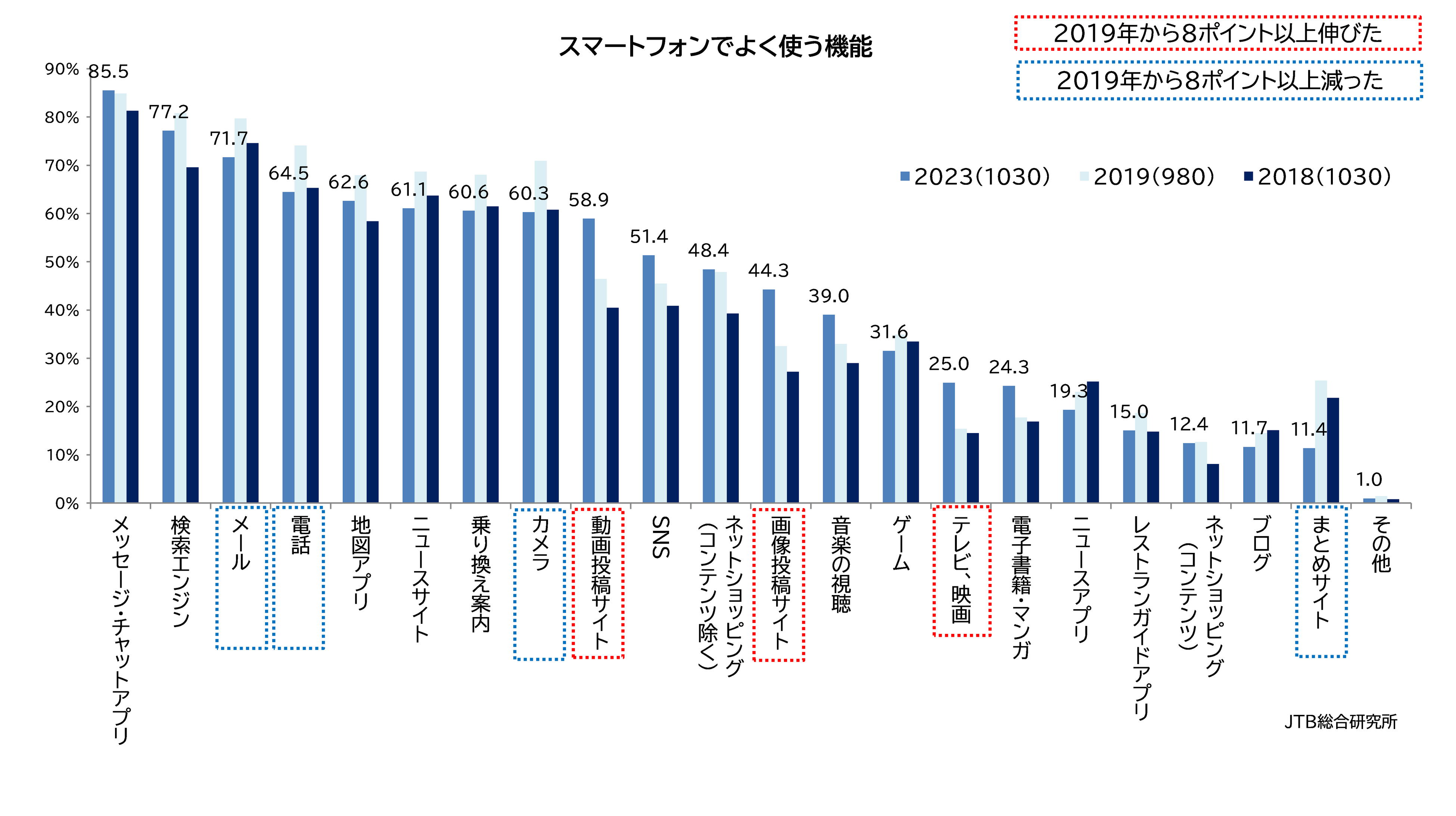 スマートフォンでよく使う機能として、電話やメールの割合は2019年の調査時より大きく減少し、個人的なコミュニケーションは「メッセージやチャット」が中心となっていることが明らかとなりました。