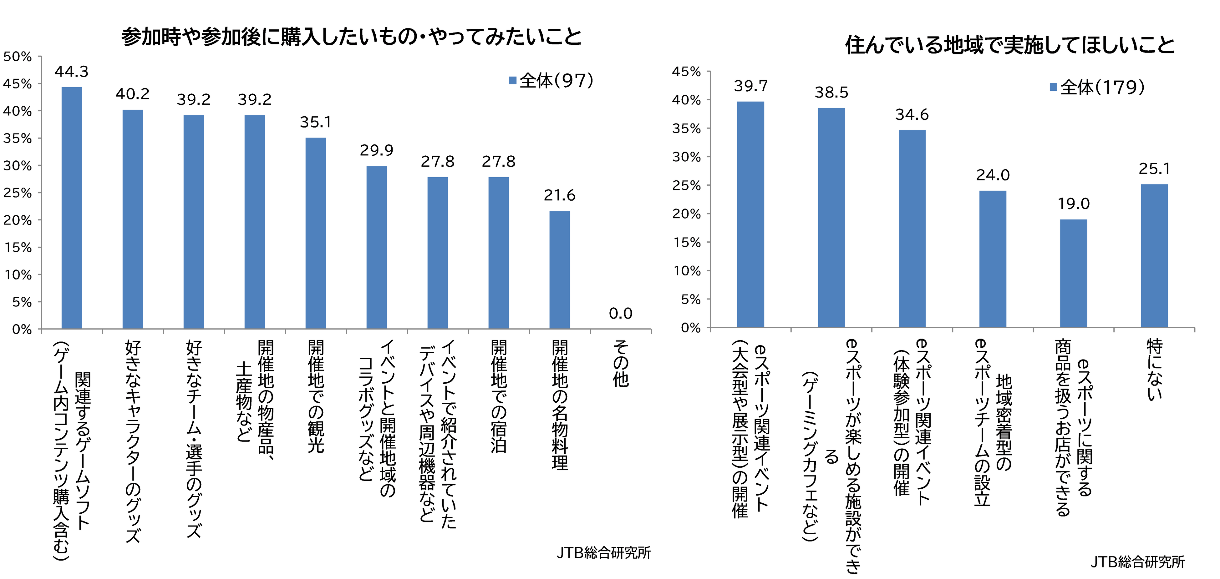 また、参加時や参加後には、3割~4割程度の回答者が、「関連するゲームソフト(ゲーム内コンテンツ購入含む)」、「好きなキャラクターのグッズ」、「好きなチーム・選手のグッズ」、「開催地の物産品、土産物など」、「開催地での観光」、「イベントと開催地域のコラボグッズなど」を購入してみたいと回答しており、消費にもつながっていることがわかります(図10)。