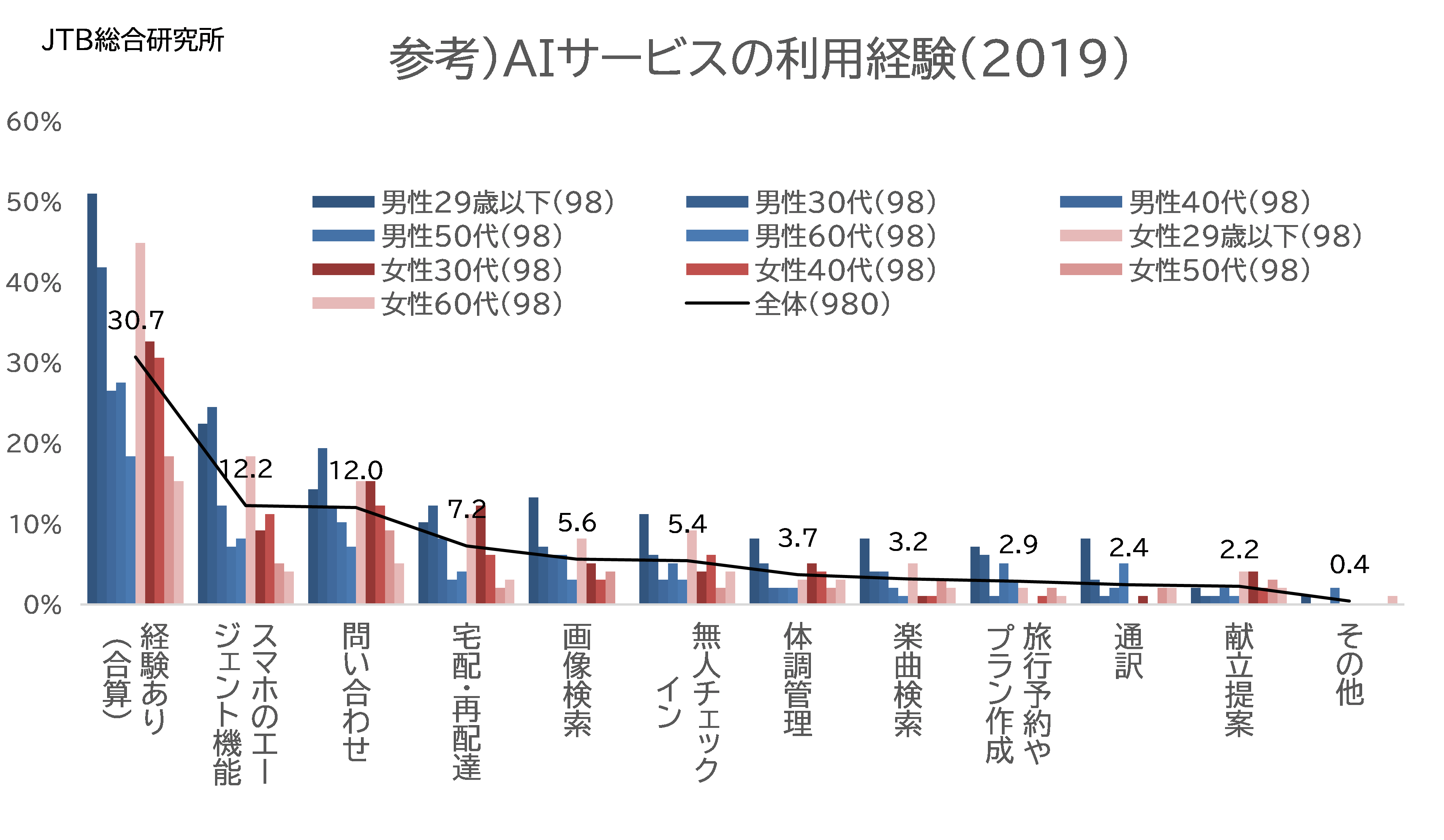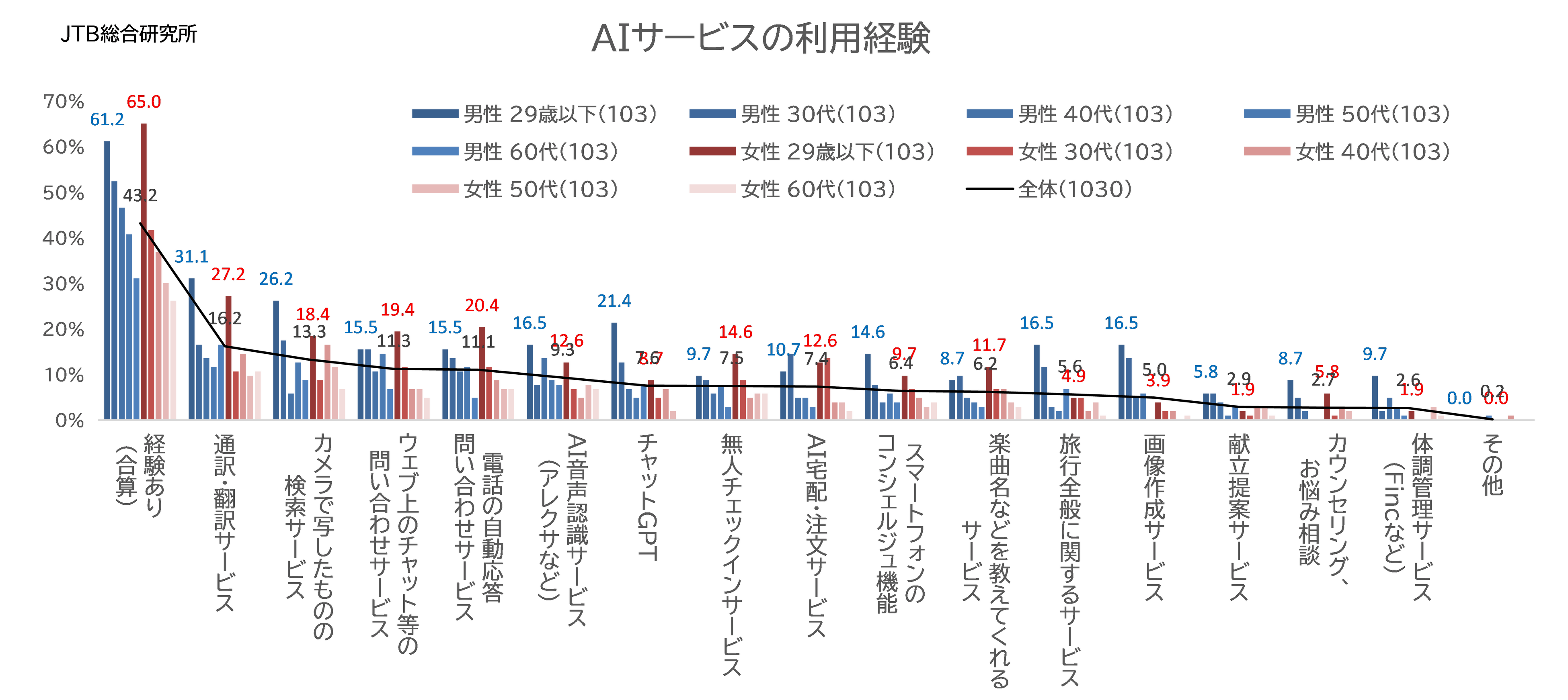 旅行関連のAIサービス利用については、「旅行中にわからないことを相談できる」、「一人旅でも困らない」など、旅ナカで利用することの順位が上がり、「自分では思いつかないところを提案してくれる」、「予約購入やプラン作成などの手間がはぶける」といった、旅マエでの活用に関する項目は順位が下がりました。旅行関連のAIサービスの利用は、旅マエから旅ナカへとシフトしているのかもしれません。