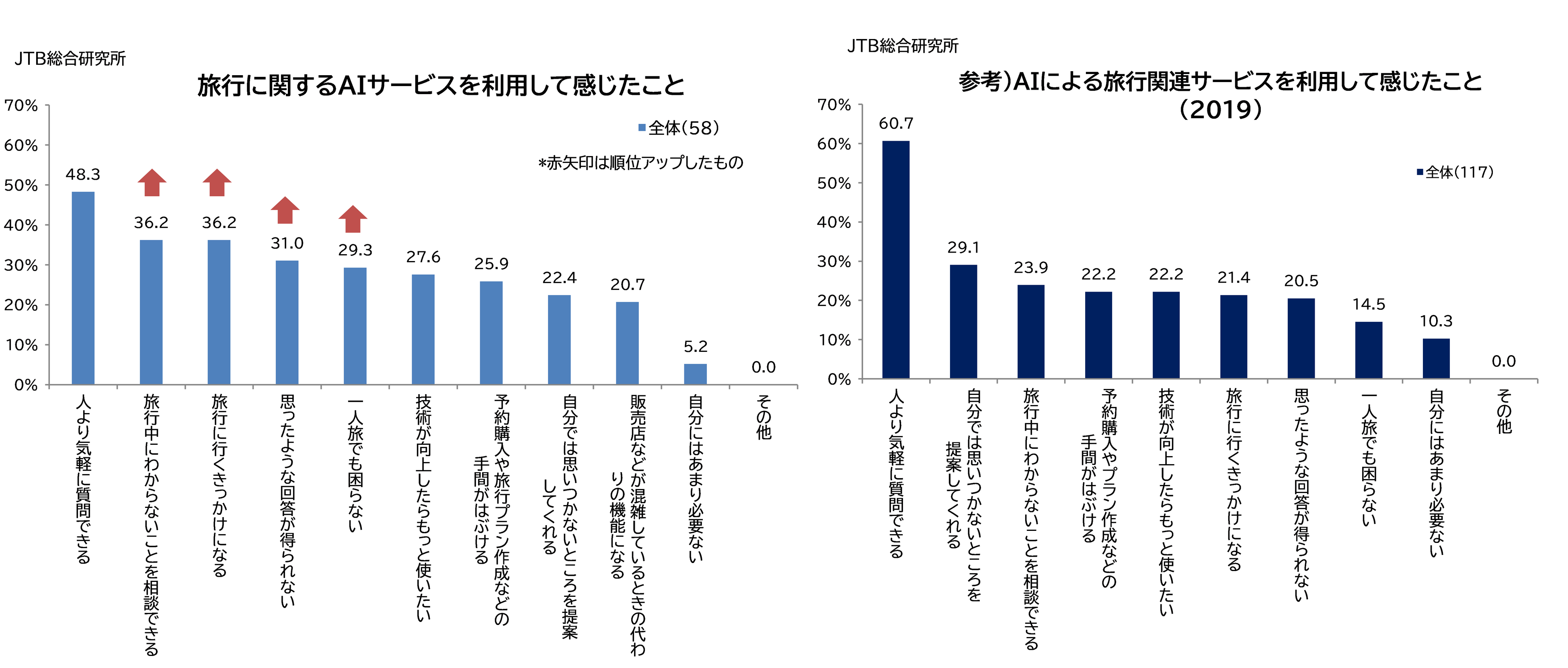 旅行関連のAIサービスを利用して感じたことは、2019年調査と比較して「旅行中にわからないことを相談できる」、「一人旅でも困らない」の順位が上昇