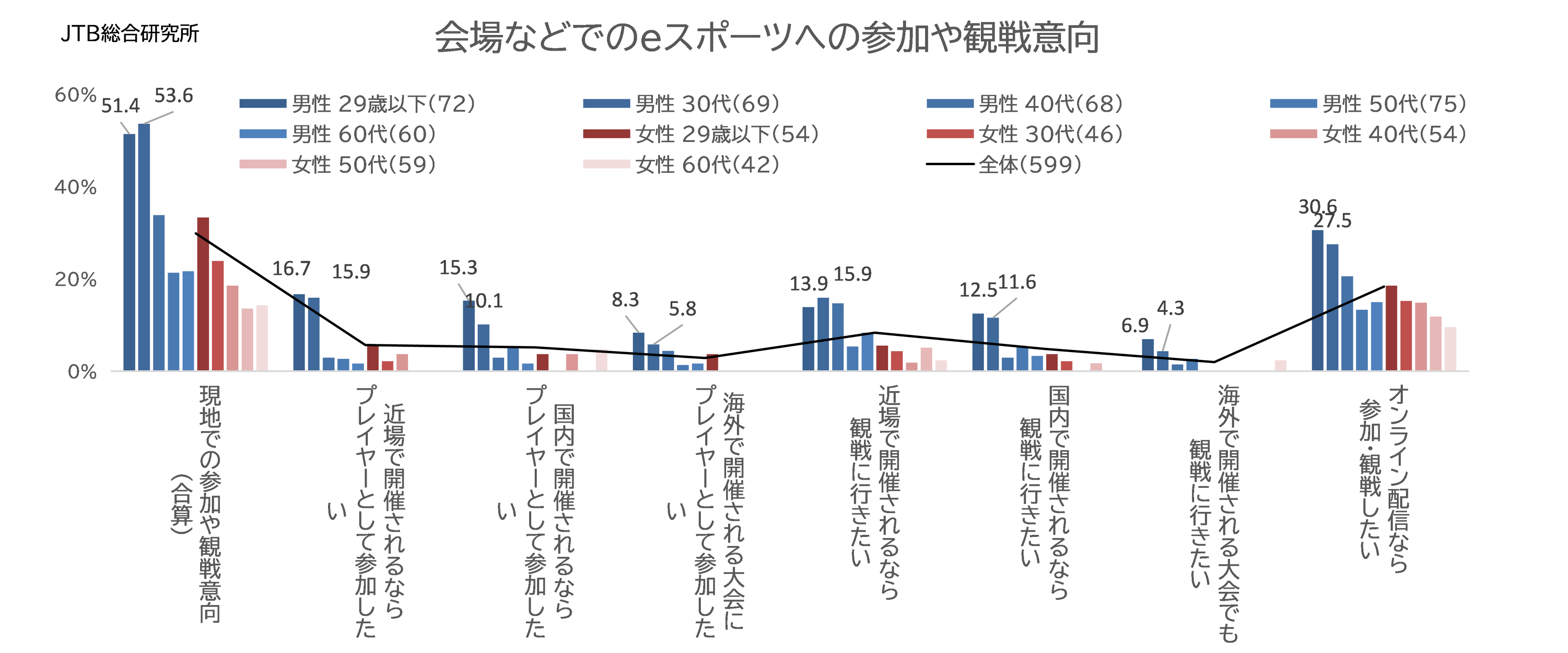 eスポーツの経験や関心についても、29歳以下と30代の男性で高い傾向がみられ、eスポーツをプレイしたり観戦したりした経験がある人の割合は、全体では12.6%でしたが、29歳以下の男性では33.0%、30代男性では28.2%となりました(図8)。会場での参加や観戦意向についても、29歳以下と30代の男性では5割を超えています(図9)。