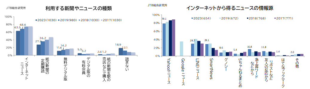 また、2019年から8ポイント以上減った項目としては、「まとめサイト」が上がりました(図1)。利用するニュースや新聞の種類としては、インターネットニュース、紙やデジタル版の利用がいずれも減少しています(図2)。