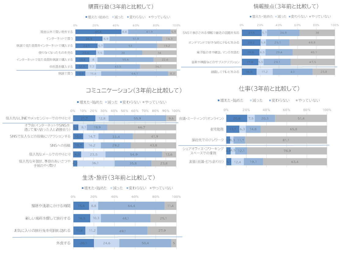 前章までの結果にもあったように、「インターネットで表示される情報で最新の話題を知る」や、「個人的なLINEやメッセンジャーでのやりとり」なども増えた項目としてあがっています。