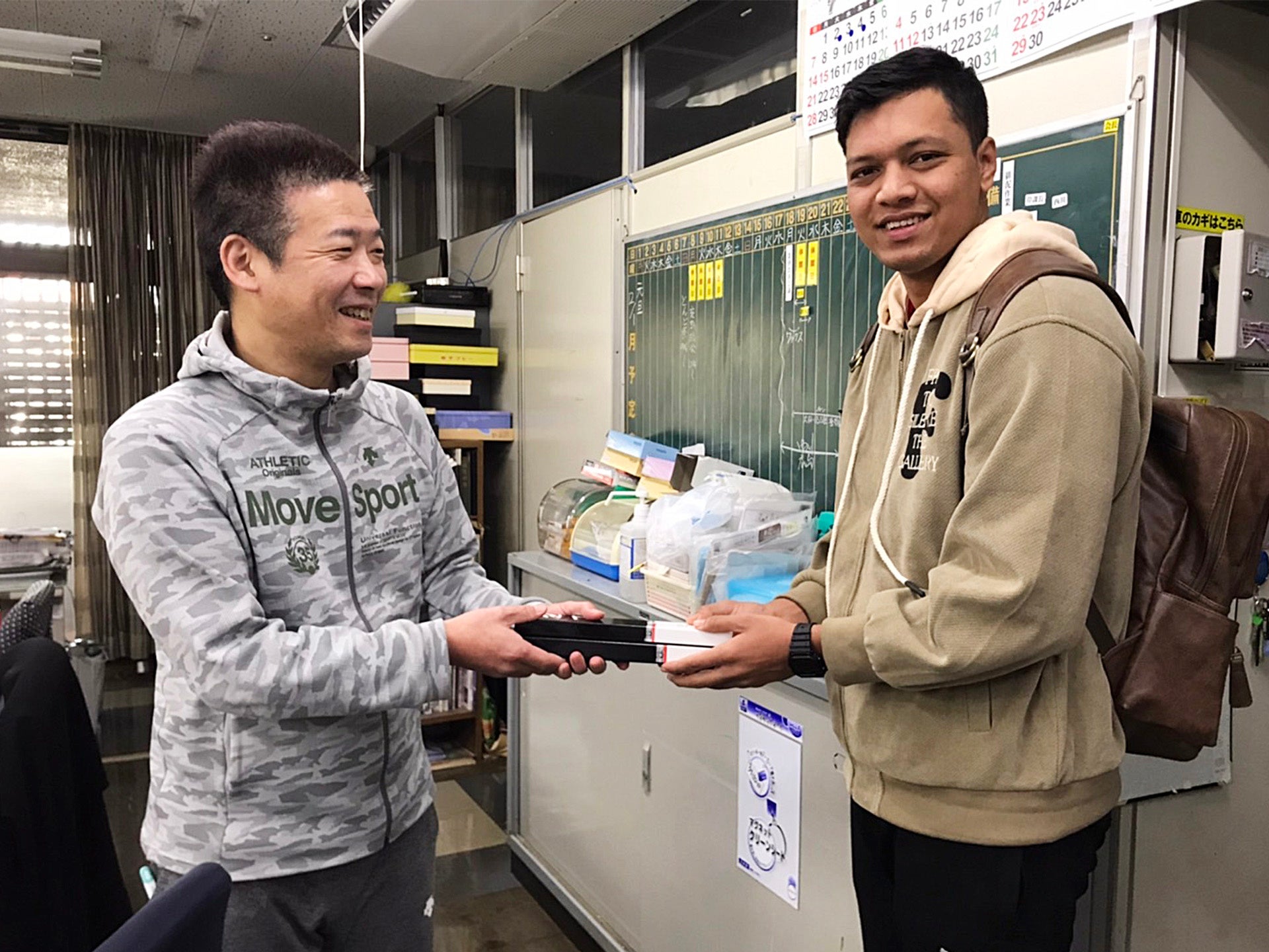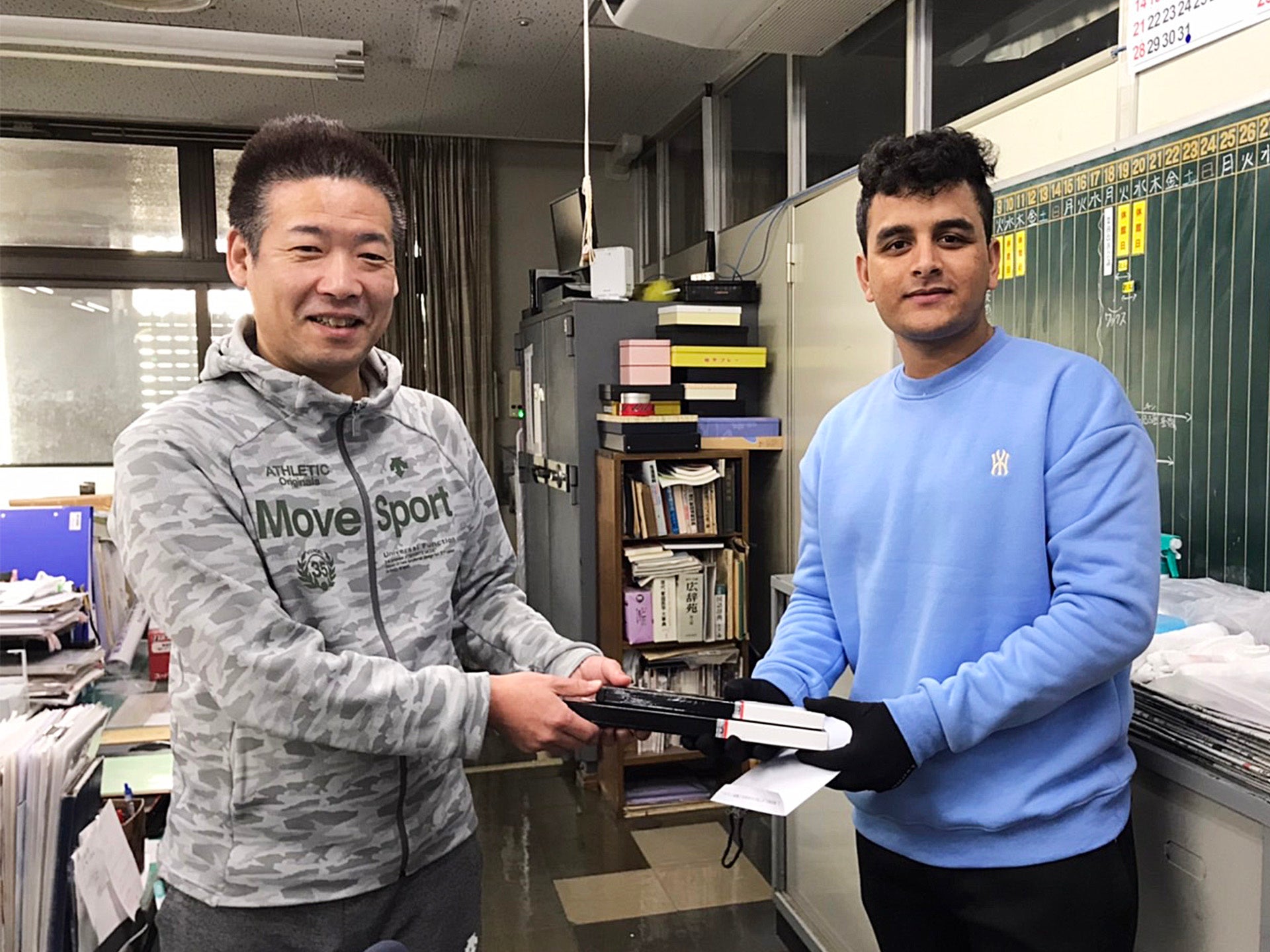 調理部門に配属された二人に、代表取締役の中島氏より業務で使用する包丁が贈呈されました。