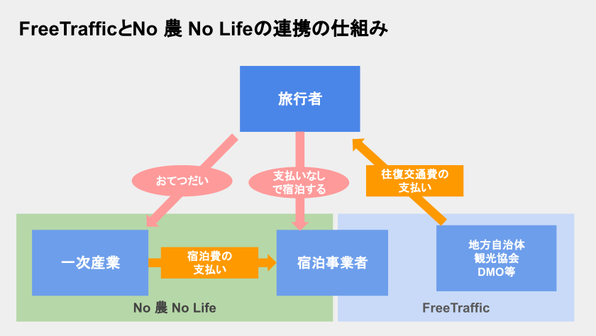 ◆利用者はFreeTrafficと「No 農 No LIFE」を併用して、1日3~4時間のおてつだいをすることで、宿泊費と往復交通費を負担せずに地方で滞在可能になります。