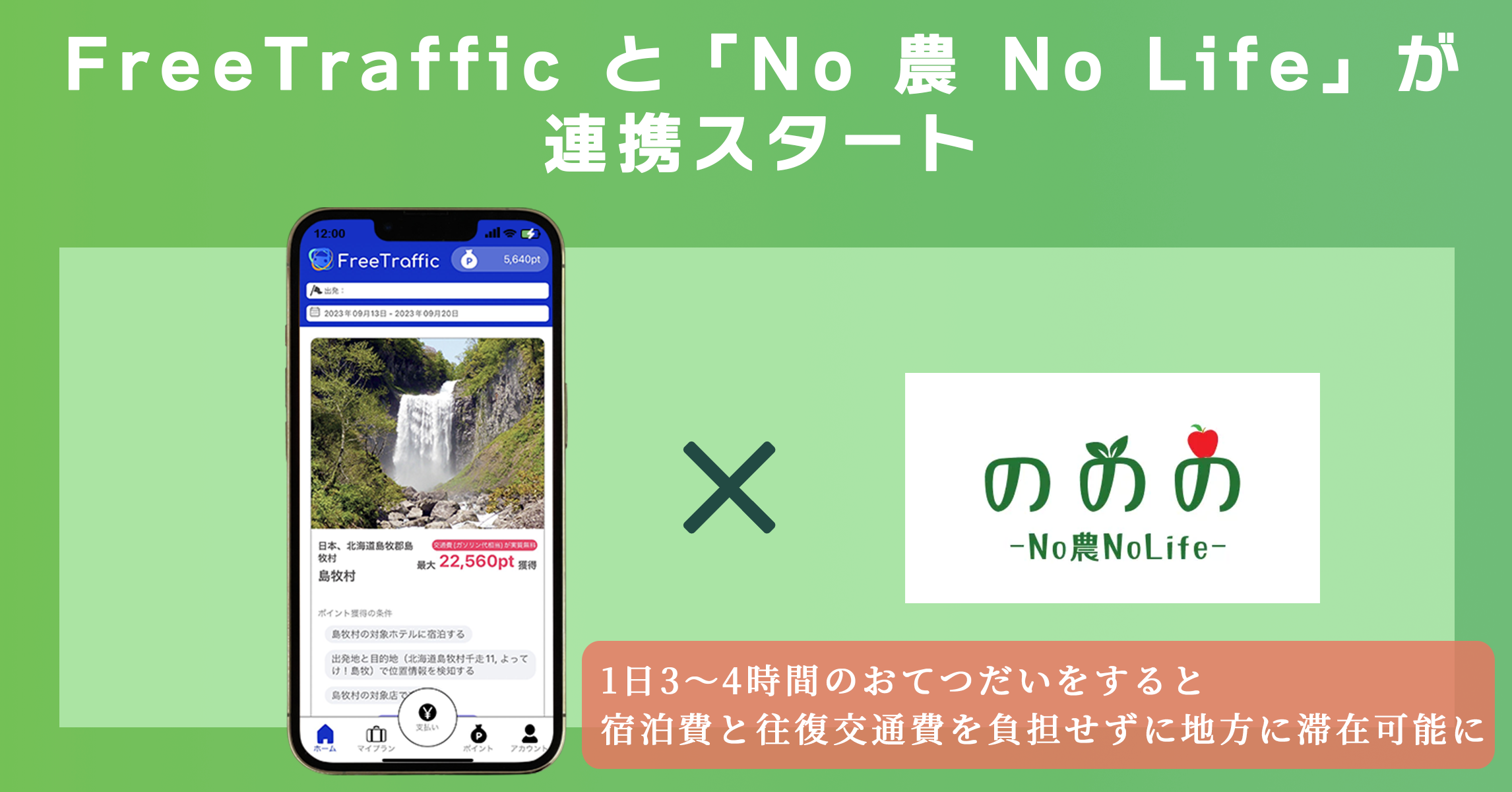 ◆条件達成※1で交通費分のポイントがもらえるアプリFreeTrafficを運営するスタートアップ企業のFourwin株式会社(東京都中央区、代表取締役社長:永瀬 駿平)は「農への仕切りを限りなく低くする」をビジョンに掲げ、農業とワーケーションを組み合わせた新サービス「No 農 No LIFE(略称:ののの)」を展開する株式会社Perma Future(本社:静岡県沼津市・代表:池田 航介)と業務連携を開始しました。