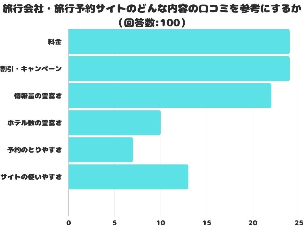 旅行会社・旅行予約サイトのどんな内容の口コミを参考にするかをアンケートにて調査したところ、1位は「料金」でした。