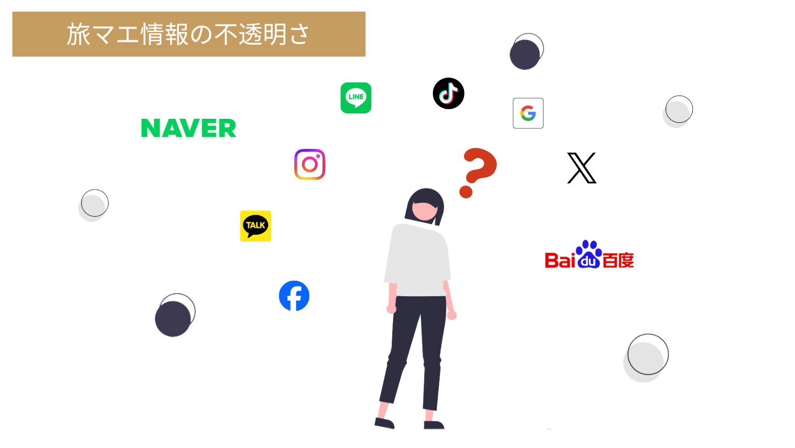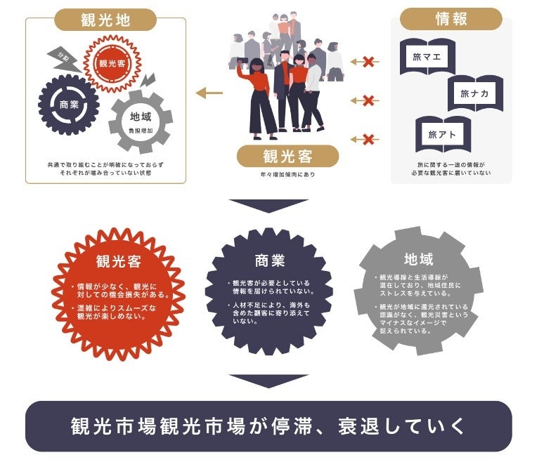 観光情報の不透明さにより、観光客に本来の魅力を100%体験してもらえず、観光市場が停滞、衰退をしている現状です。