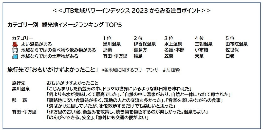 株式会社JTBは、地域活性化事業の一環として、全国240地域のイメージや訪問満足度などを調査し、インデックス化した「JTB地域パワーインデックス2023」調査結果をまとめました。