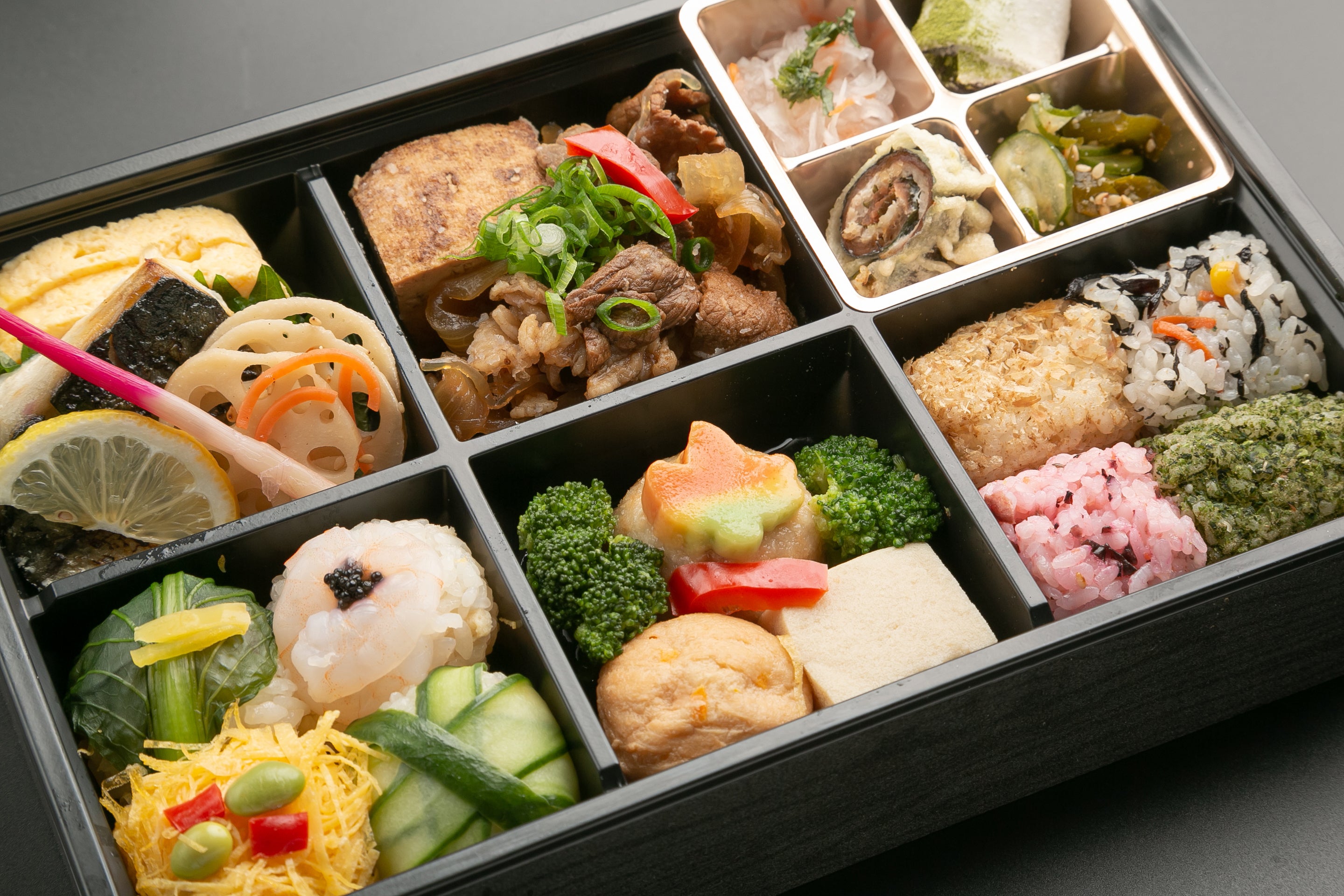 【黒毛和牛すき焼きと季節の手毬寿司、4色俵むすび弁当】
