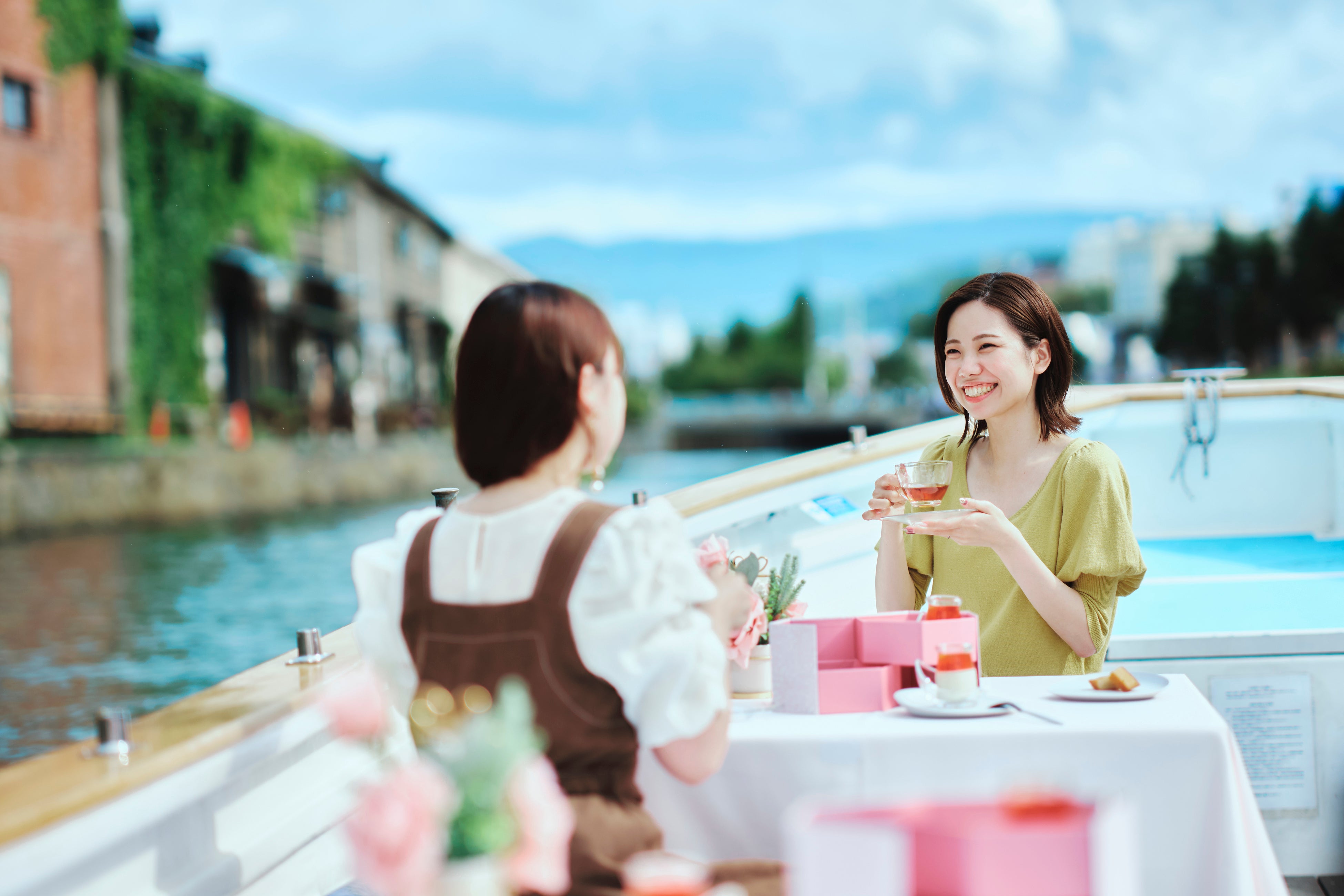 通常、⼩樽運河で運航している船はベンチ席ですが、本プログラムではテーブル付の船を運航。アフタヌーンティーをゆっくりと楽しめるよう、テーブルクロスやクッションを船内に設えます。約40分間の乗船中は、心地良い春の陽気を感じながら、歴史的建造物が建ち並ぶ⼩樽の街並みを眺める、優雅なクルージングを楽しめます。