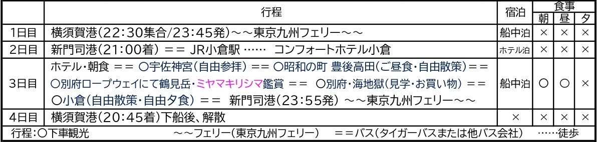 利用船舶は、2021年就航の東京九州フェリー「はまゆう」「それいゆ」