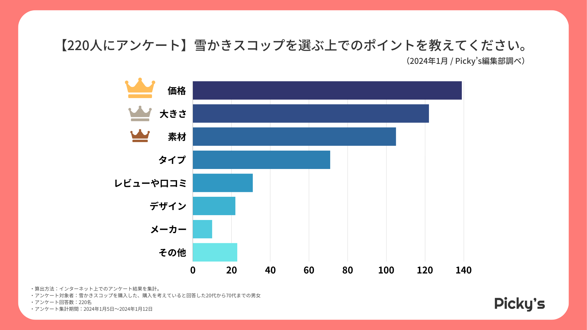 アンケート結果から雪かきスコップを選ぶ際のポイントには、「価格」、「大きさ」、「素材」がポイントと考える人が多いことがわかりました。回答数が最も多い1位の「価格」は、購入者はコストとのバランスを重視していることが見受けられます。2位の「大きさ」や3位の「素材」など雪かきスコップは実用性や耐久性、デザイン、口コミなど様々な要因が選ぶ際に影響していると考えられます。