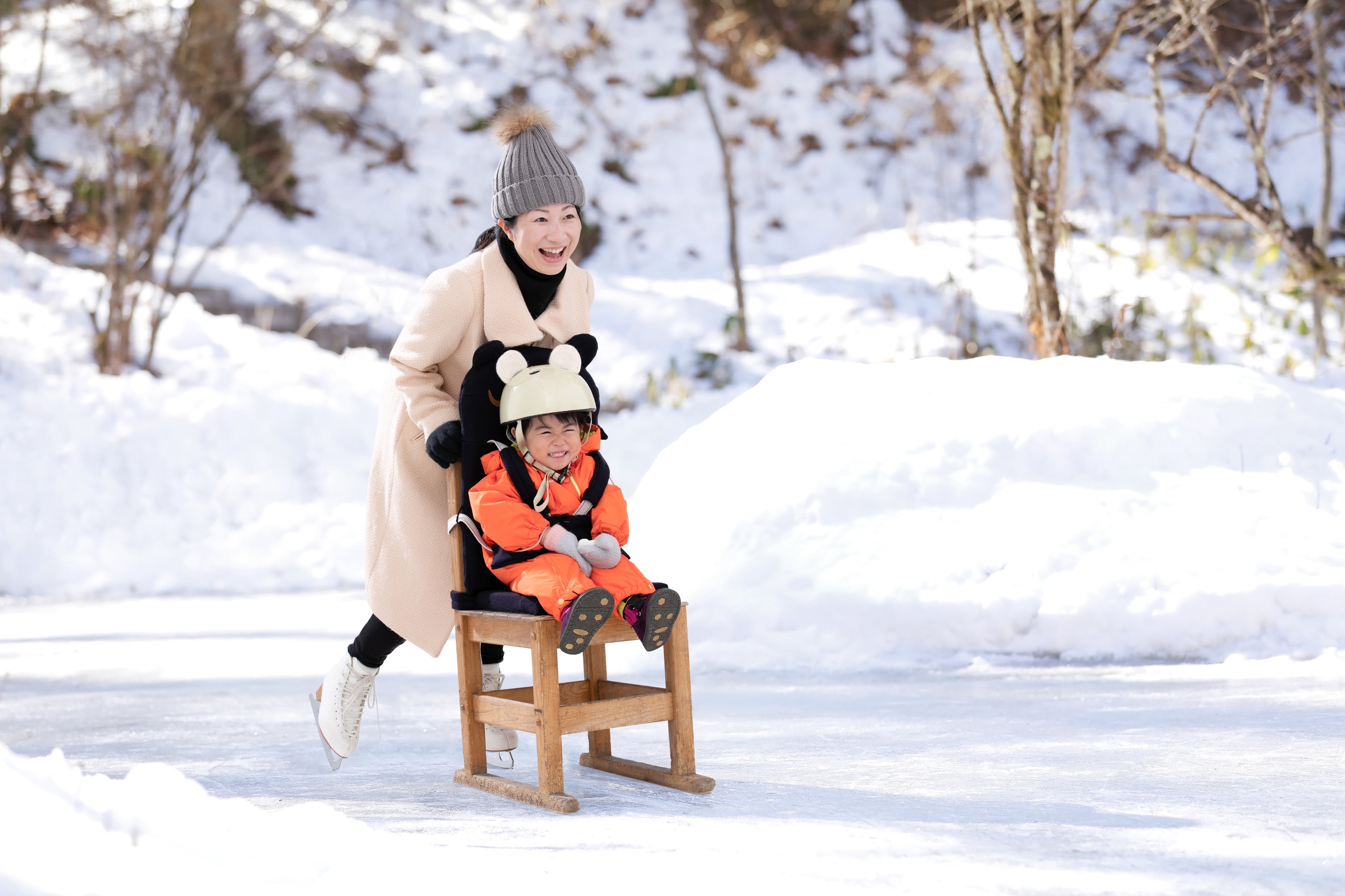 『スケート靴は履けないけれど、スケートの雰囲気を体験させたい』というご家族の声にお応えし、小さなお子様専用シートを載せた「こぐまのそり付き椅子」を用意しています。車のチャイルドシートと同じように、お子様の両肩と腰をベルトで固定できます。大人が押しながら滑ることで、スケート靴を履けない小さなお子様も氷上を滑走するスピードを体感し、大人と一緒に楽しむことができます。森に暮らすツキノワグマをデザインし、楽しく体験できる工夫をしました。