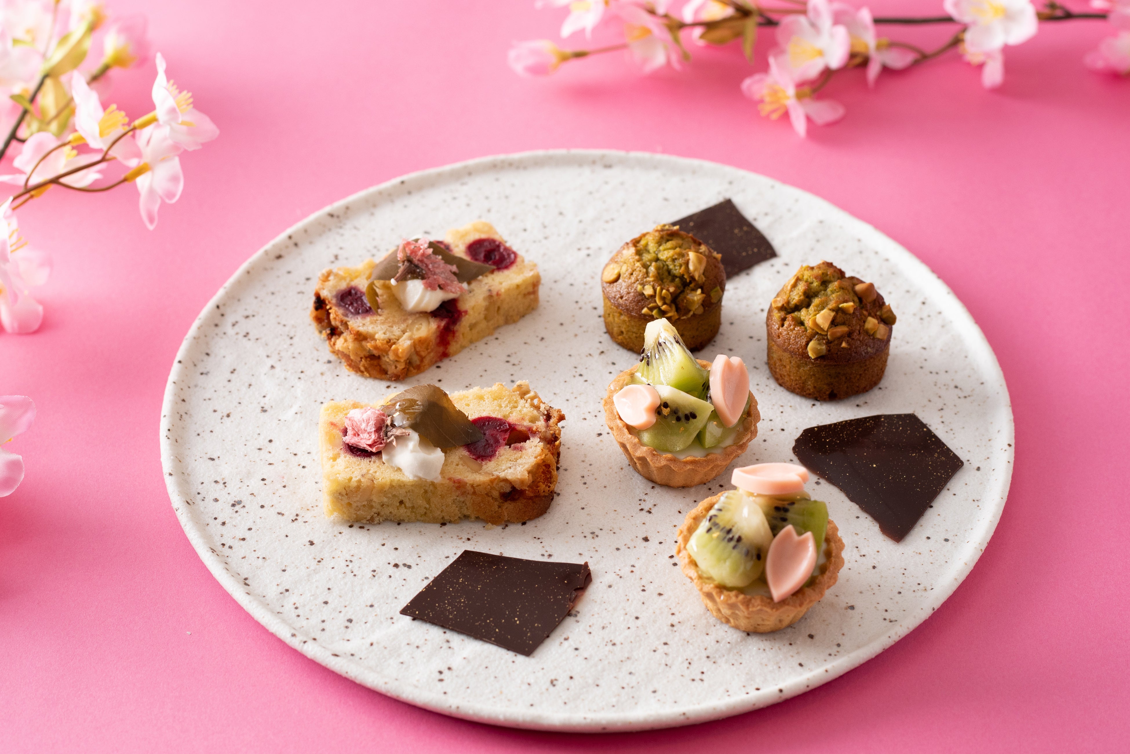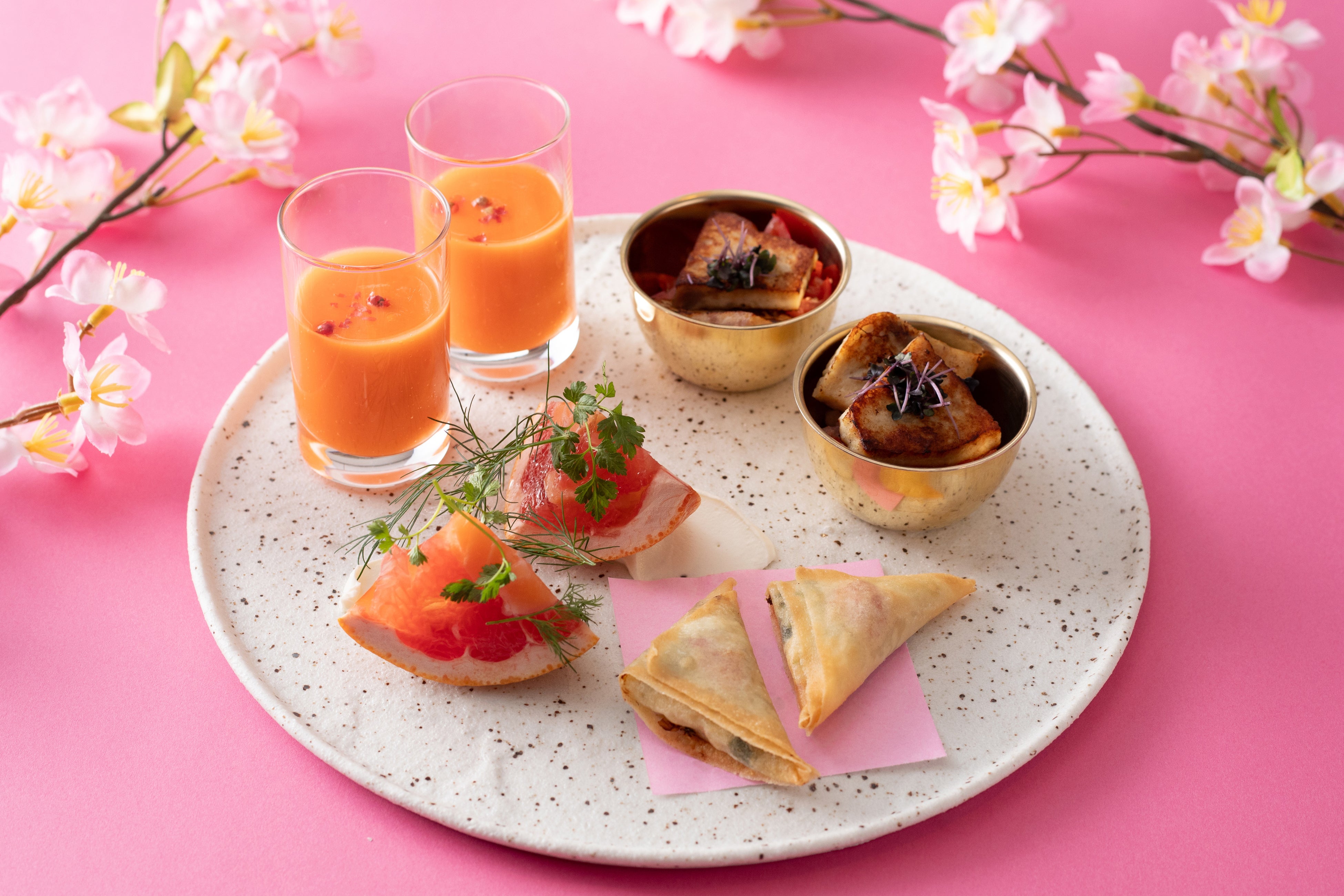 スイーツには、桜のヴェリーヌ、桜と苺のルビーチョコムース、いちごとピスタチオのフィナンシェといったラインナップに加え、セイボリーには浅利と菜花の桜春巻き、桜鱒とピンクグレープフルーツのジュレ、春人参と甘酒のジンジャースムージーなどが揃います。