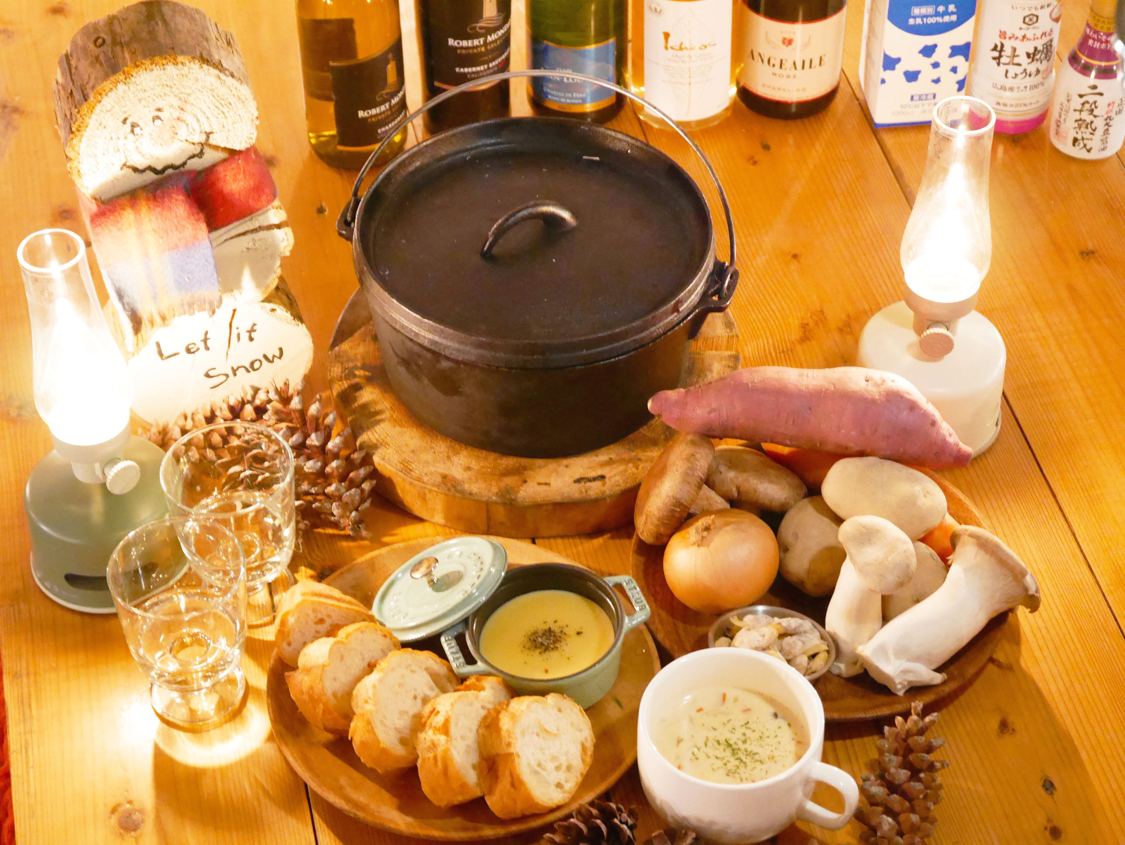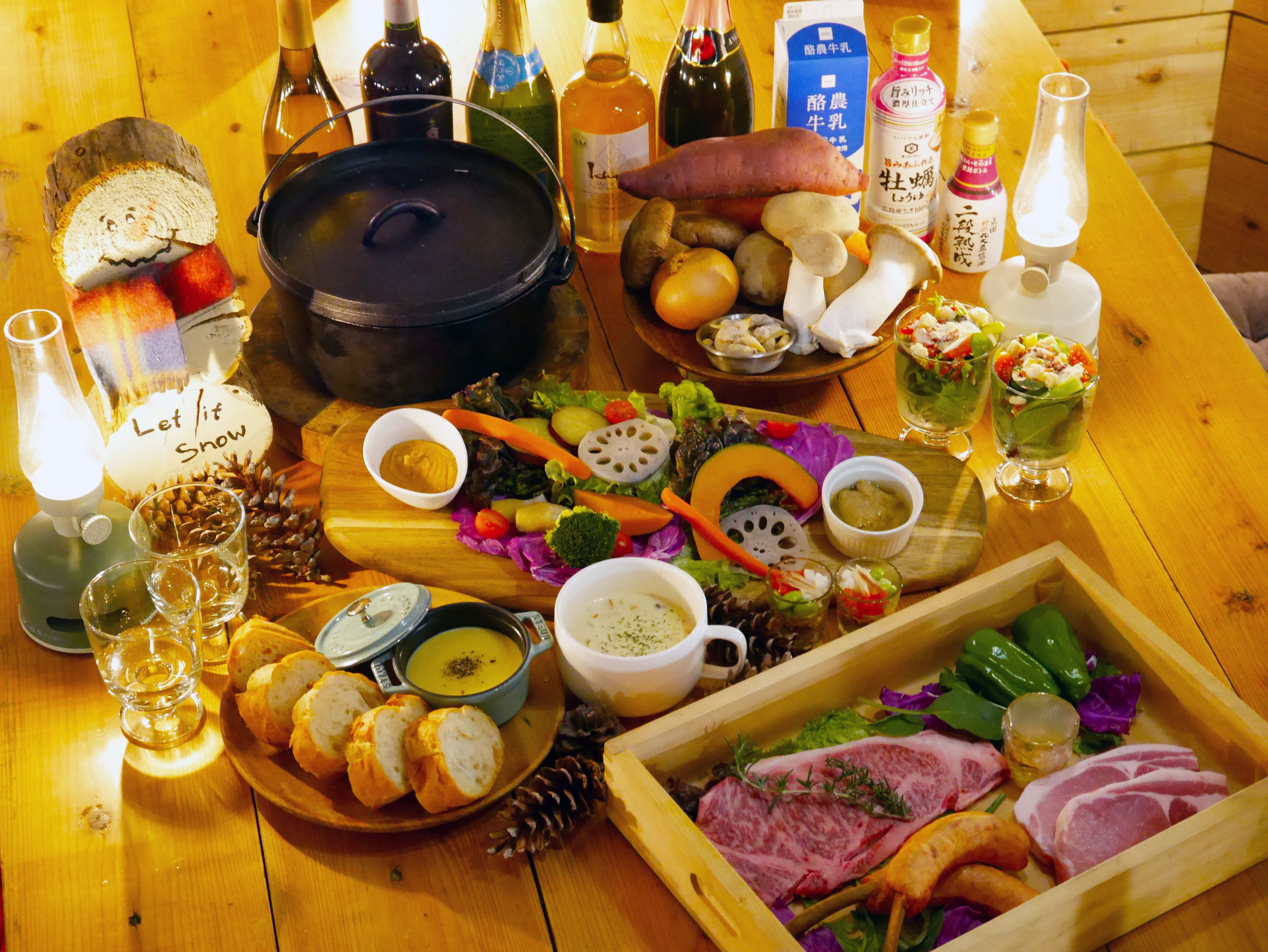 メインの赤城牛はもちろんのこと、冬限定で登場する旬の地元食材をふんだんに使用した、小さなココットのチーズフォンデュと焼き立てバゲット・身体温まる特製クラムチャウダー・バターナッツかぼちゃスープ・ダッチオーブンで炊き上げる 群馬名物さくらごはんの3品と共に、ディナーを豪華に彩ってくれる9品をご提供いたします。