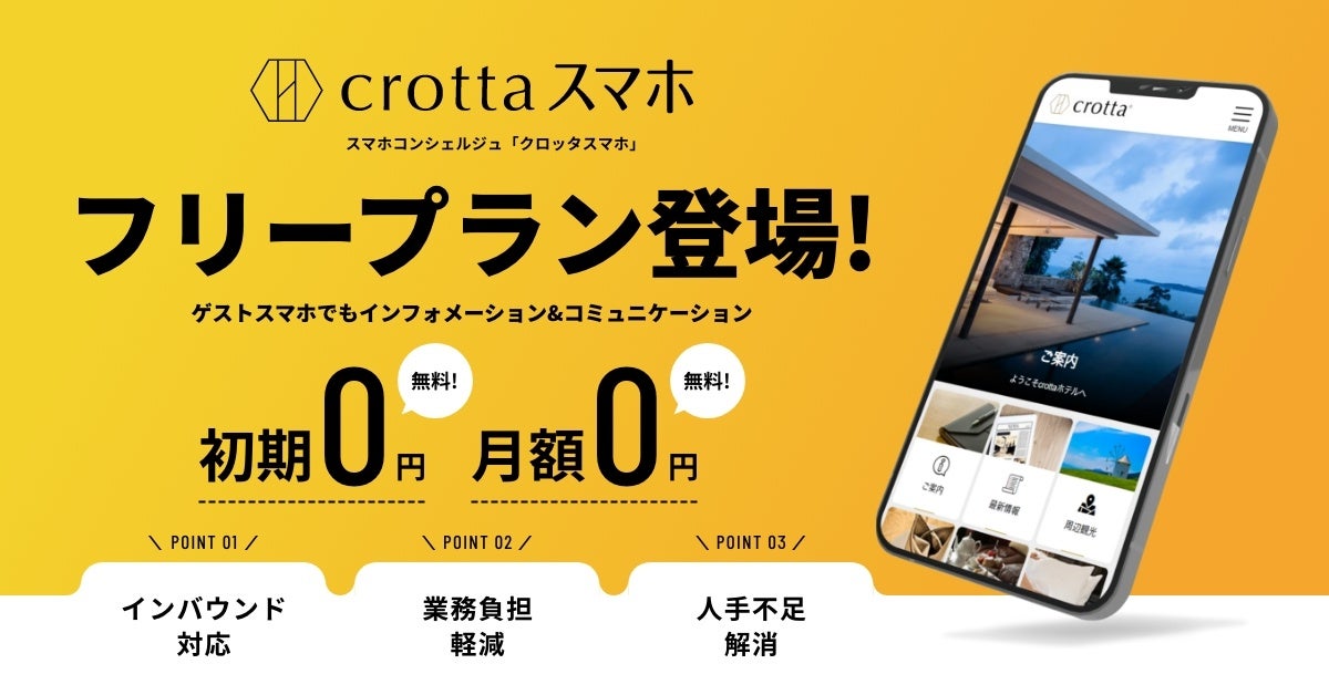 スマホコンシェルジュ「crottaスマホ」フリープランを導入することで”紙の配布をやめてデジタル化をしたい””インバウンド需要が増えてきて多言語の案内をしたい”などの課題に対して費用をかけずに解決することができるようになります。これまでIT導入の費用をなかなか捻出できなかった宿泊施設も、無料で手軽にトライアル導入が可能となりました。