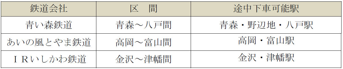 ・氷見線・城端線・七尾線・越美北線をご利用の場合、「あいの風とやま鉄道」「IRいしかわ鉄道」「ハピラインふくい」の以下の区間は、特例としてJR線へ通過利用する場合に限りご利用いただけます。(「IRいしかわ鉄道」の津幡~金沢間は特急列車もご利用いただけます。)※ 途中下車可能駅以外の駅で下車した場合(区間内での下車、区間を越えた乗車等)は、別に全乗車区間の運賃が必要です。