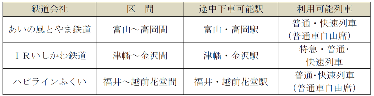 ・2024年3月16日乗車分以降、金沢~敦賀間(「IRいしかわ鉄道」「ハピラインふくい」)はご利用になれません。ご利用の場合には別途、ご利用になる区間に有効な乗車券類が必要となります。