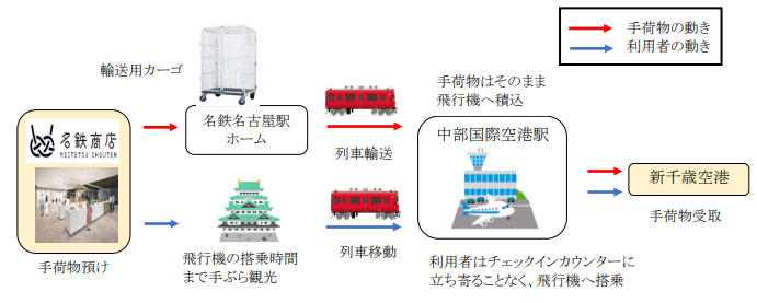 ㈱名鉄生活創研が運営する名鉄商店(名鉄百貨店本店[メンズ館]1F)店舗内設置の受付ブースで手荷物を預かり、名鉄名古屋駅ホームまで運搬して、専用列車に積み込み中部国際空港駅まで輸送後、対象の航空便に積み込みます。