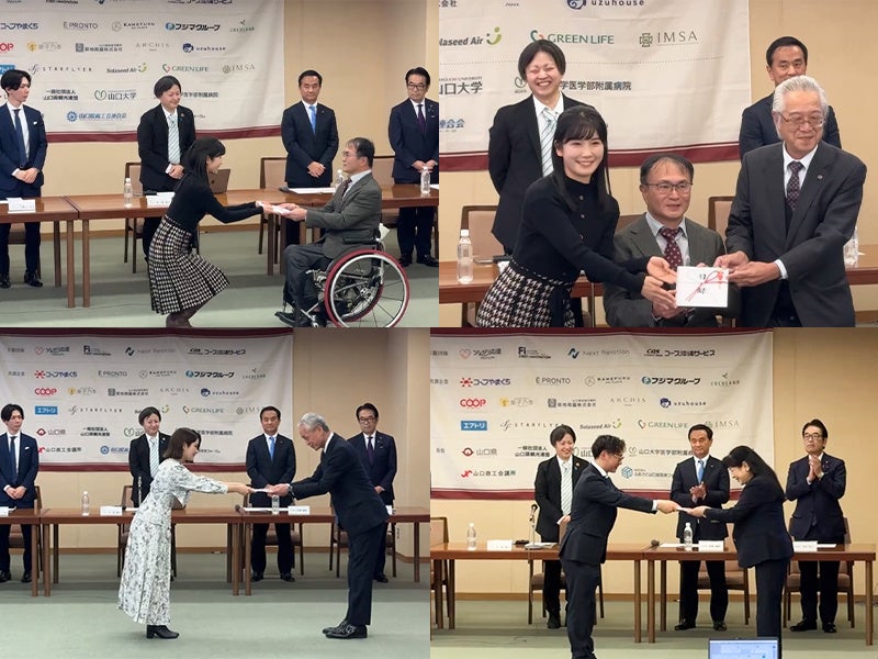 左から、「山口大学医学部附属病院」病院長 松永和人様、グリーンライフ株式会社 代表取締役社長 玉井 信行様、株式会社プロントコーポレーション 代表取締役社長 杉山和弘様、生活共同組合コープやまぐち理事長山崎和博様