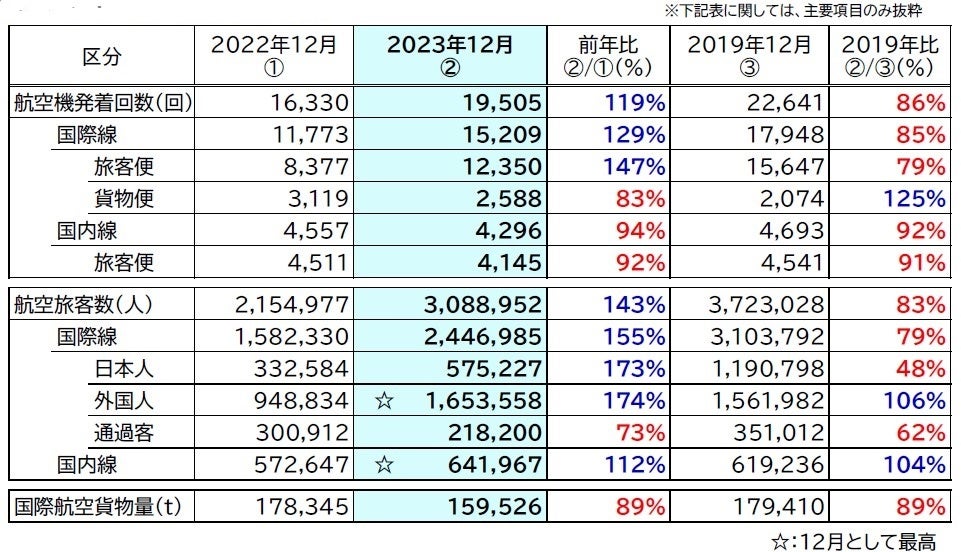 ●国内線旅客数は、12月として最高の64.1万人(前年同月比112%、2019年同月比104%)を記録し、発着回