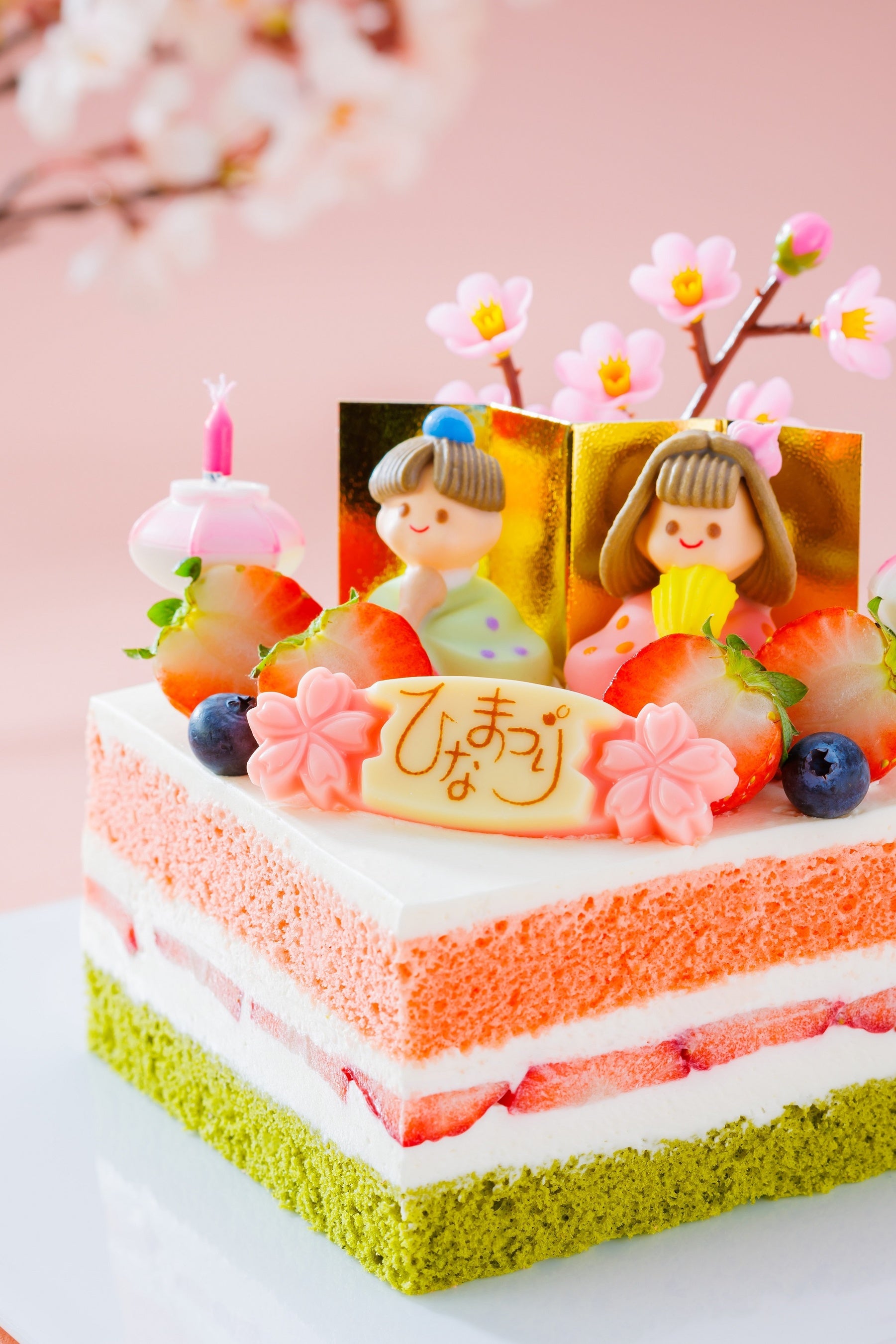 ケーキは3層仕立てで、苺の風味がふんわり香るピンクのスポンジと小さなお子様でも食べやすいよう苦みを抑えた抹茶のスポンジで、お子様も大好きなたっぷりの生クリームと国産の苺を挟みました。きめ細やかなスポンジと口あたりの良いクリームが相性抜群のケーキには、仲良く寄り添うお内裏様とお雛様や、梅、ぼんぼりを可愛らしくデコレーションし、ひなまつりのお祝いの席が笑顔であふれるよう願いを込めました。